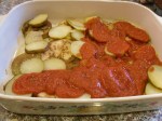 In large skillet, pour a couple of tablespoons of olive oil around skillet then sauté eggplant slices until partially cooked, Using tongs, place eggplant in a layer in bottom of big rectangle 11 by 13 inch baking dish. Next, partially cook potato in same skillet, adding 1/3 cup water. Then add this layer on top of the eggplant. Salt and pepper the eggplant-potato layer to taste. Pour two cups marinara sauce on top of potato and eggplant.