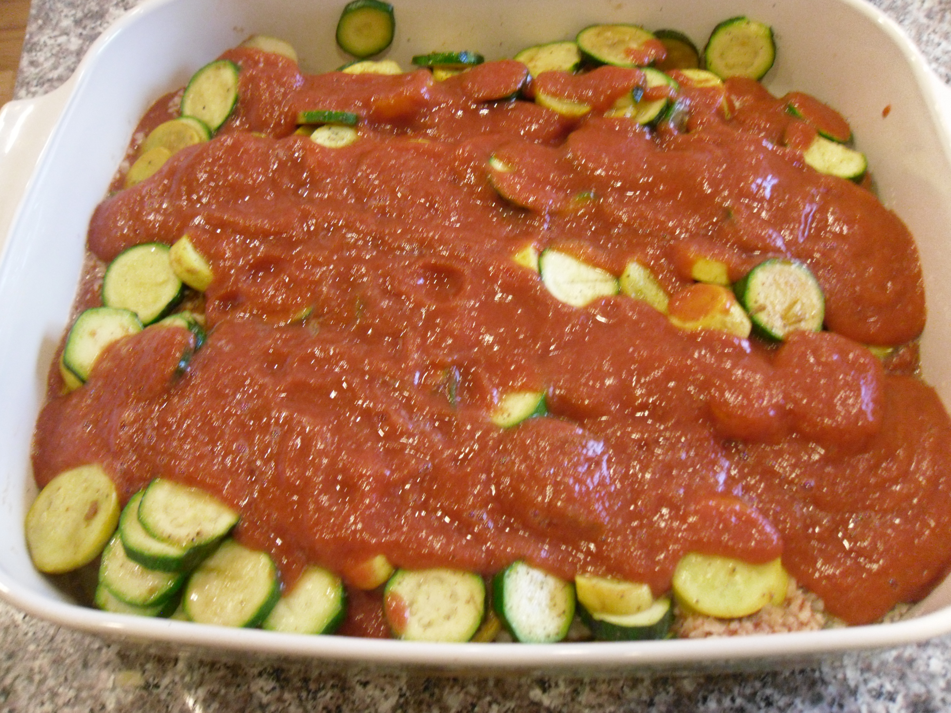 Lay Swiss cheese or other white cheese on top of this layer. Next (using same skillet), lightly sauté zucchini and yellow squash together, adding more oil if needed. Put this layer on top of Swiss cheese. Lightly salt and pepper the squash. Pour two more cups of marina on top of squash.