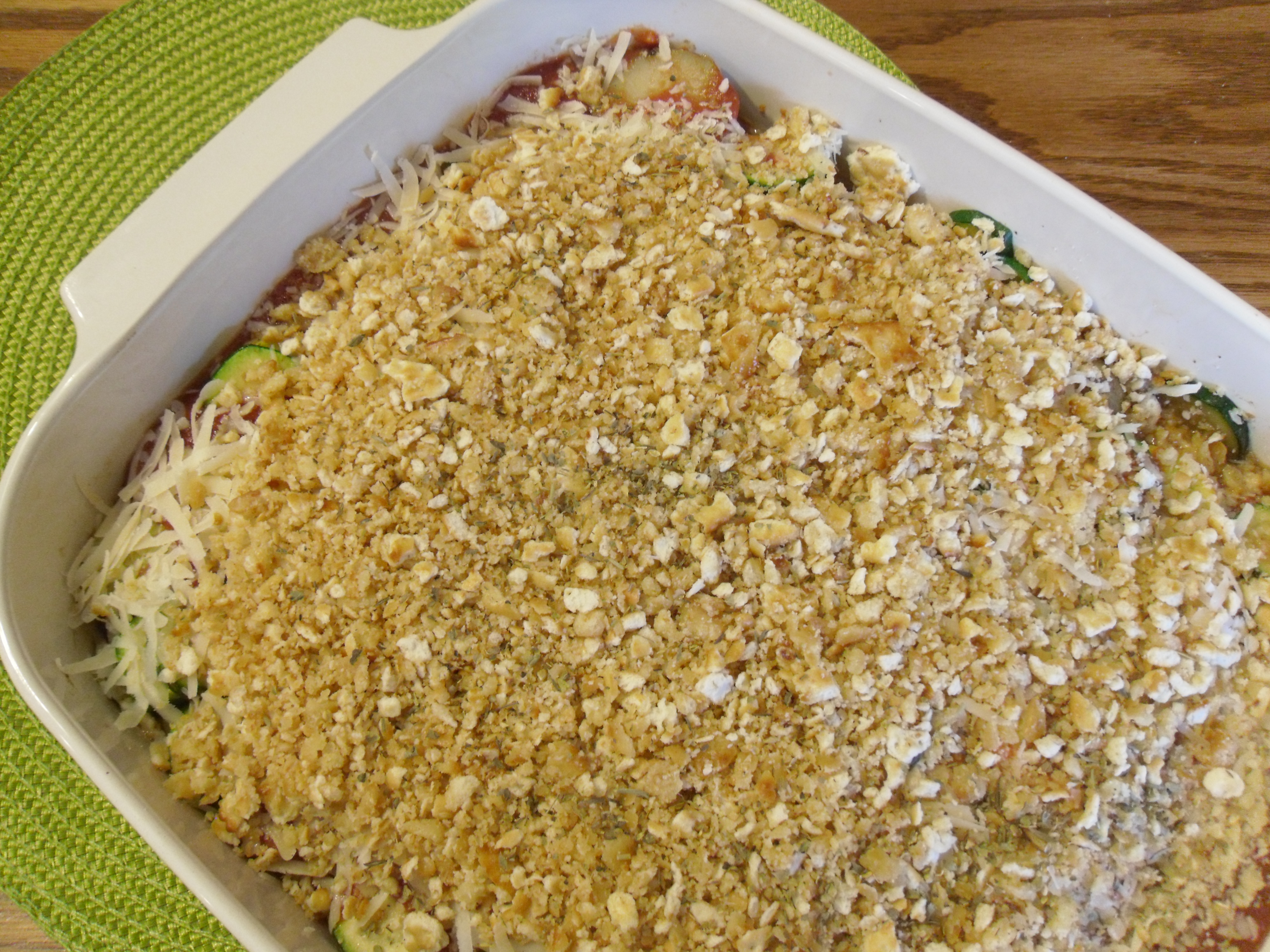 Sprinkle with Parmesan cheese (or vegan substitute) Melt butter with olive oil in skillet, add crushed crackers, and stir until evenly coated. Pour buttered crackers atop casserole. Sprinkle with 1 t. oregano or Italian seasoning.