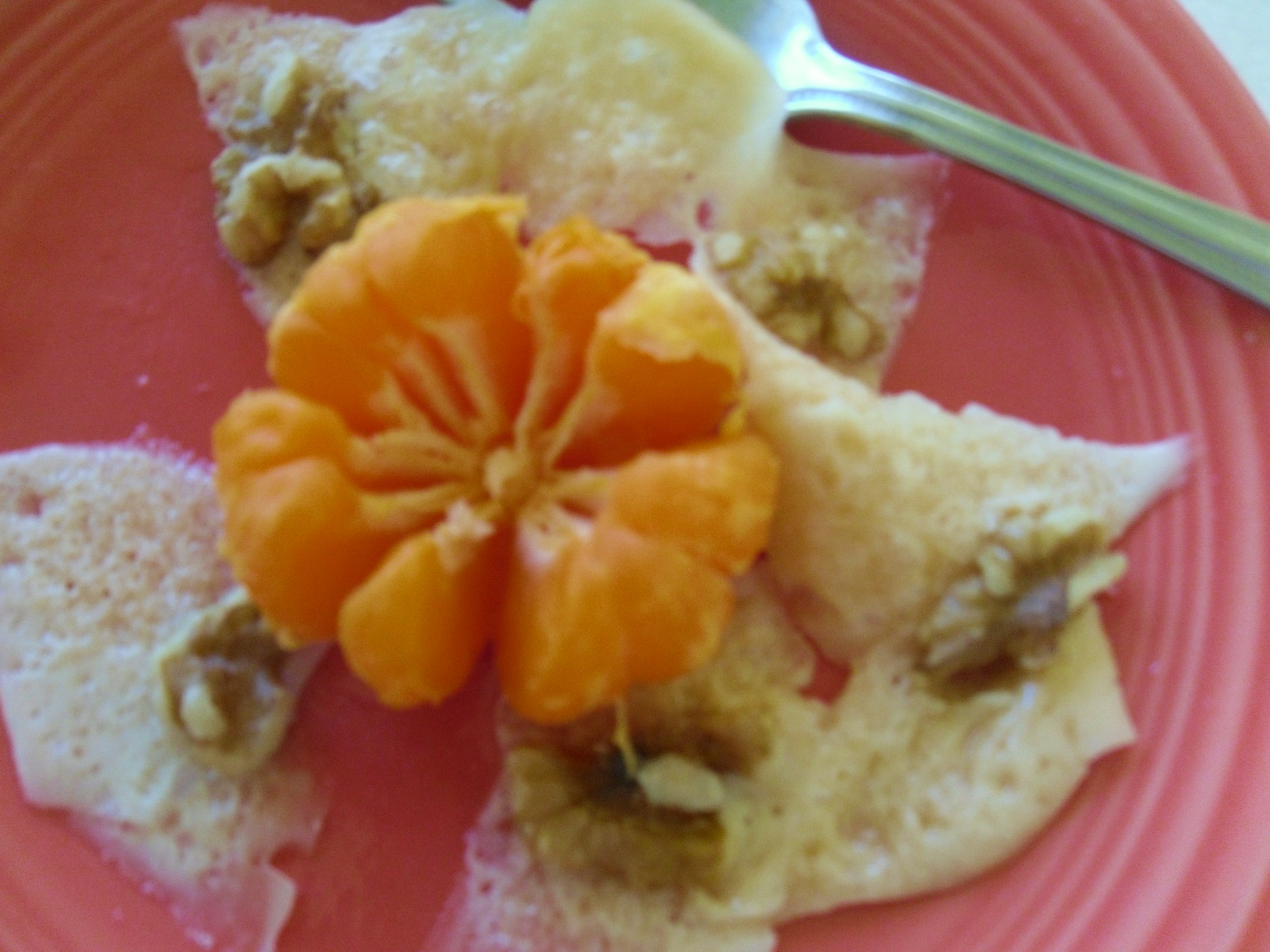Simple 3 Ingredient Delightful Bite: Parm Cheese (heated until pliable), walnuts and juicy clementines.