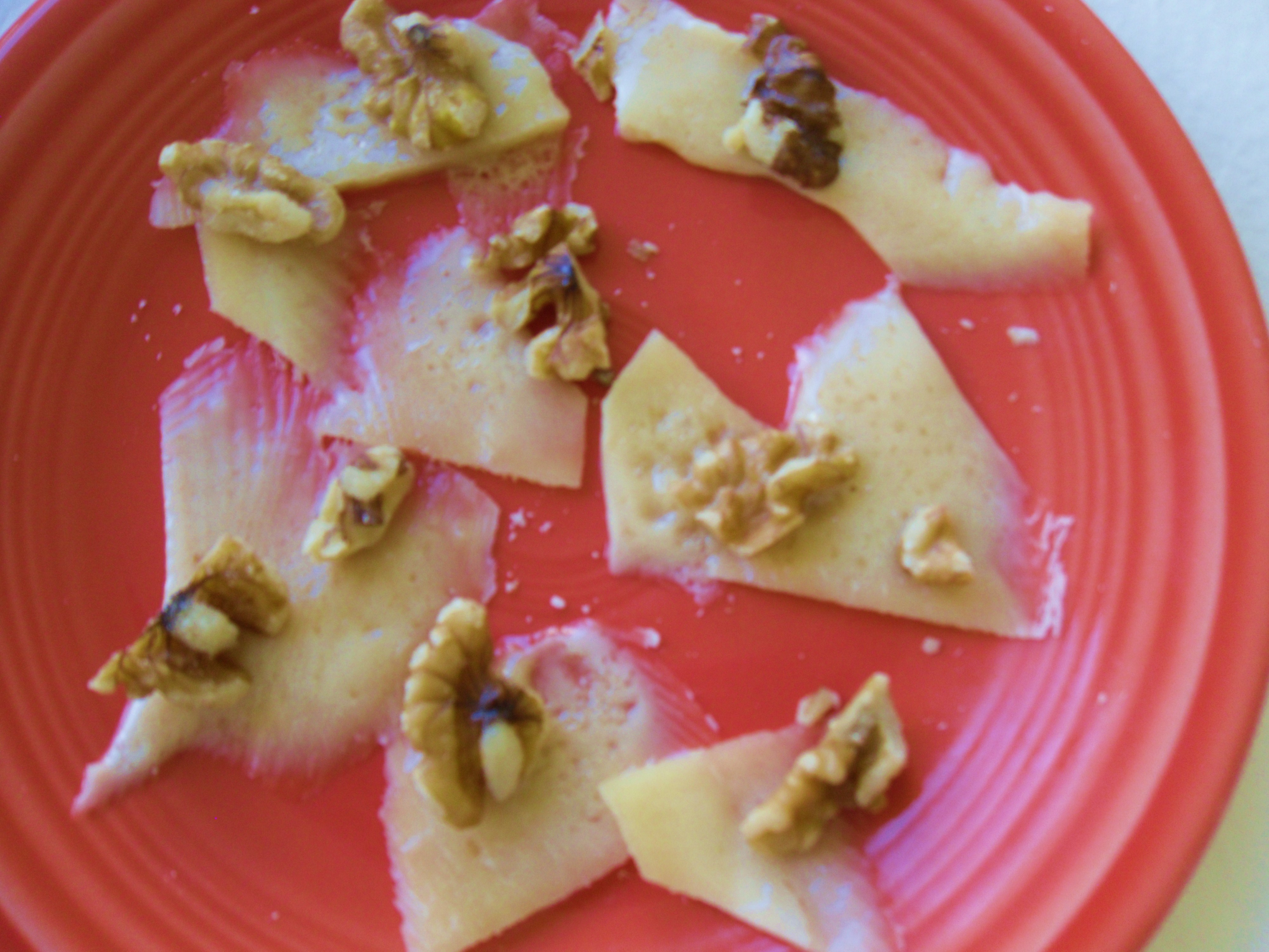 Parm shards with broken pieces of walnuts, after being nuked for 15 seconds in the microwave