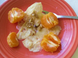 Needless to say, I’m totally in my Vacation Mind. So far today I’ve “cooked” a couple of bowls of cereal, a PBJ sandwich and peeled some string cheese and clementines. Not fancy fare worthy of food posting, really. But then, at Happy Hour time, I got inspired. I saw some Parmesan cheese and walnuts (I’d packed them in my carry-on from home), and a bowl of fresh Florida clementines (bought in haste from the local grocery last night.)  Let me tell you, these Floridians really get premium citrus. These clementines are so juicy they nearly burst in your hands as you peel them. Naturally sweet and tangy. Oh my. When fruit is this good, you don’t want to do much to it.  Just let Nature shine. So, on the fly I invented these Parm Cheese-Walnut and Clementine Appetizers.  Salty, nutty, warm meets fresh, tangy, sweet and cold.  So yummy.