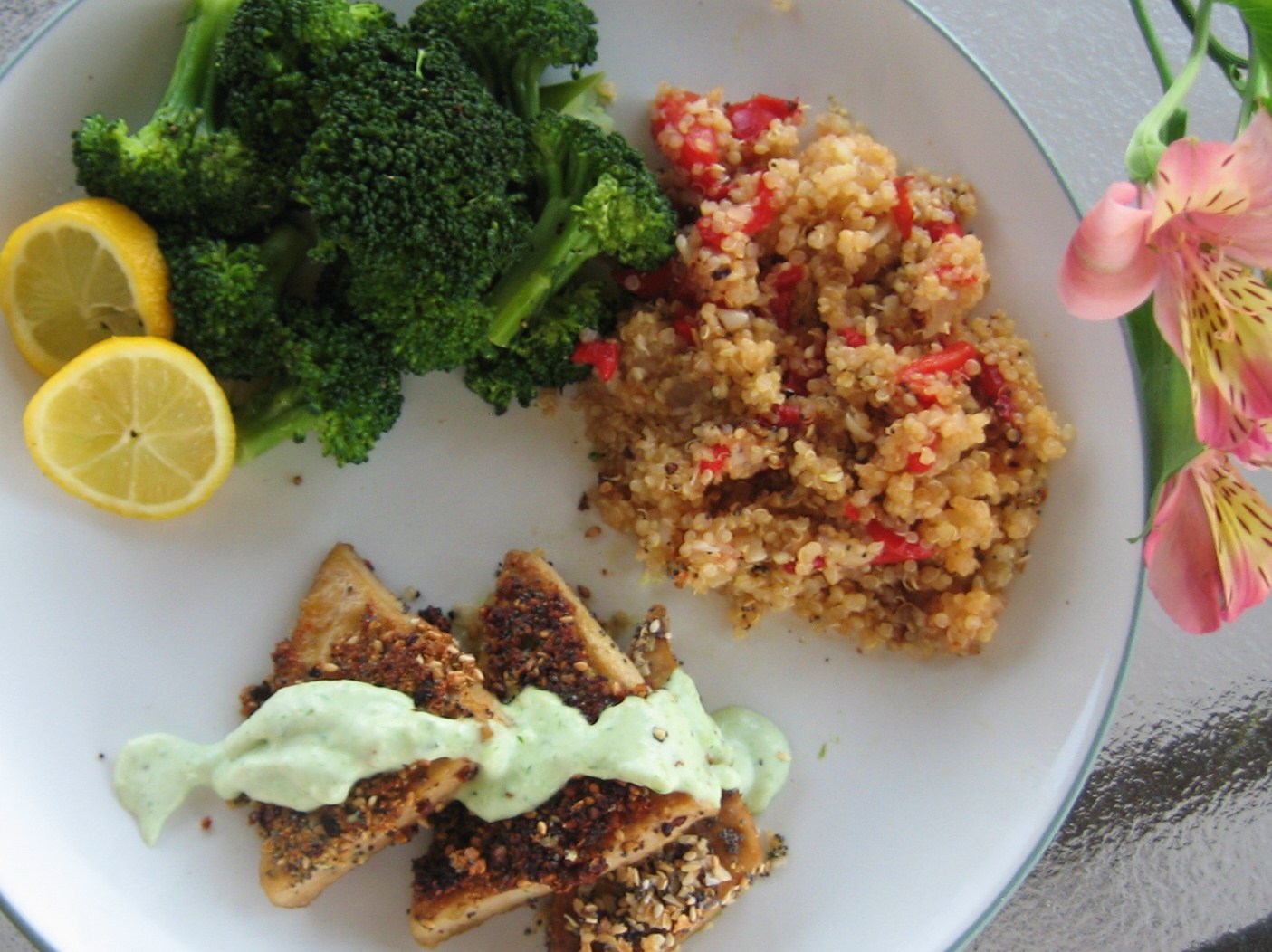 So I made Everything Tofu (tofu coated in sesame seeds, poppy seeds, onion flakes, and garlic powder) topped with a chive Tofutti cream cheese sauce, a simple side of steamed broccoli, and my latest go-to side dish, roasted red pepper quinoa. It’s so easy and with my rice maker it basically cooks itself while I get the rest of dinner made.