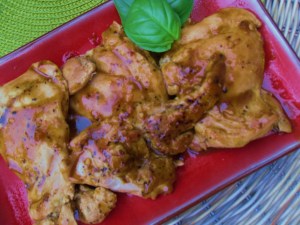 Lightly season both sides of chicken pieces with your favorite seasoned salt. In a hot large skillet with about 2 T. olive oil, saute and brown boneless chicken pieces on high heat until both sides are golden brown and chicken is cooked through. (You may want to turn down heat and cook with a lid on top if the chicken doesn’t get done in the middle, after the searing.) Remove pieces at this stage on to a platter and cover to keep warm.