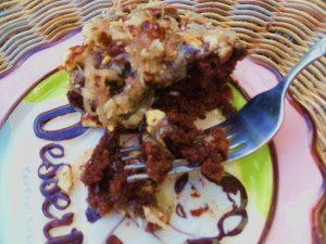 My husband had out-patient surgery this morning,  and after I made him a healthy vegetable stew,  I remembered my sister’s advice and decided give him some cake!  In searching for vegan-friendly desserts for Mother’s Day this weekend, I remembered Mom’s old stand-by, Wacky Cake.  My favorite cake is German Chocolate so I created a vegan-friendly  coconut-“butter”-almond  frosting for this cake, but used chopped almonds instead, to give it a bit more crunch.  Success!!  Though I cannot claim that this cake is healthy,  it is delicious, and it is vegan.  I couldn’t resist eating a piece of it while still warm, moist and falling apart.  Heavenly.   If you have vegans in your family, or anyone who cannot eat dairy or eggs, this is a wonderful recipe for a special occasion,  and both the cake and the frosting are super easy.