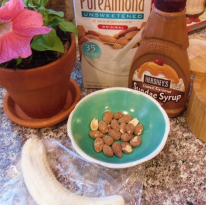 Into a blender put almonds, banana, and almond milk,  2 t. caramel syrup,  ice and small pinch sea salt. Blend until smooth and almonds are just specks.
