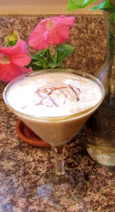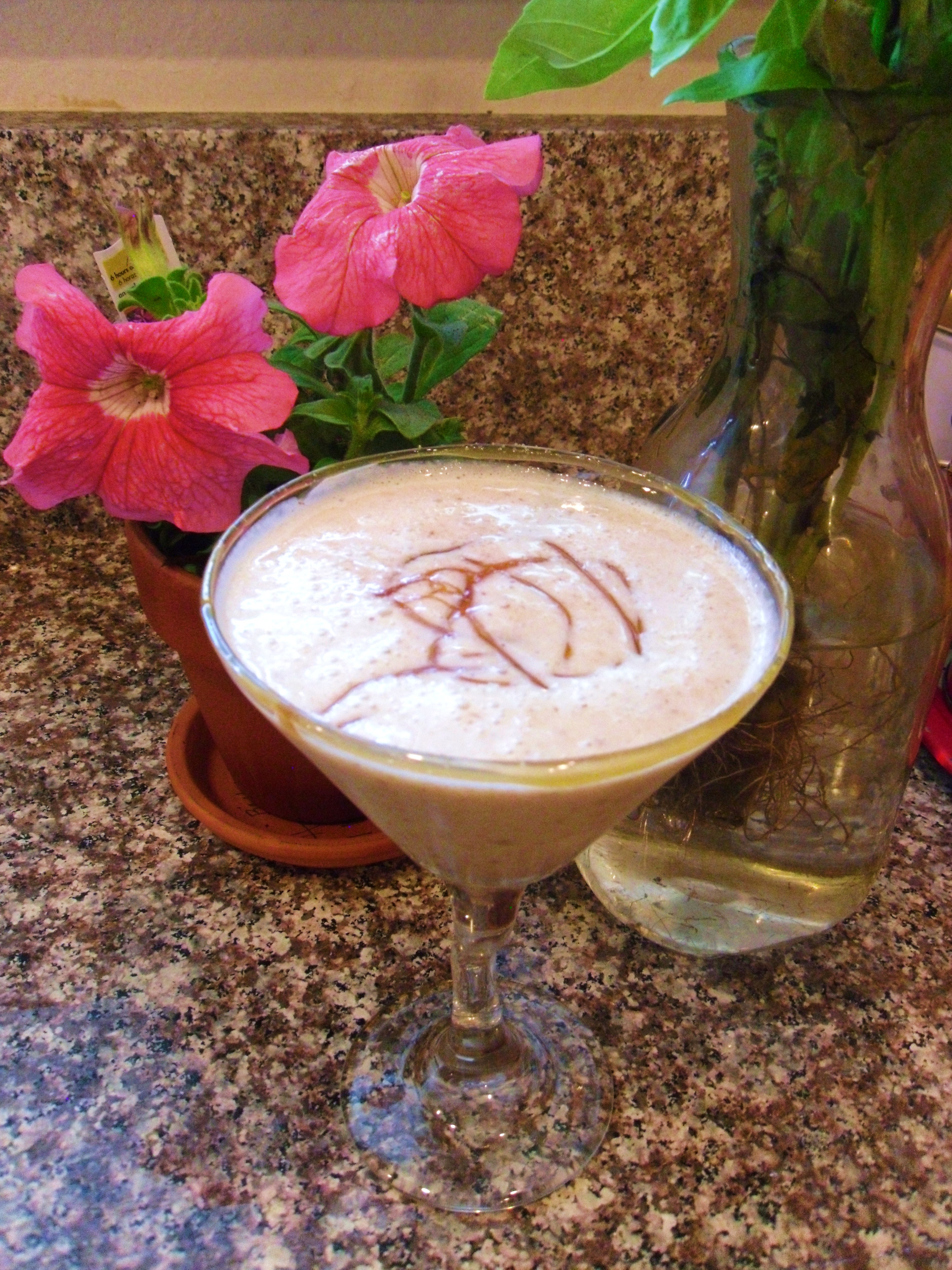 Pour half the smoothie/shake into each glass.   Squiggle a bit more of the syrup (about 1/2 t.) to garnish the top of the drink, and sprinkle with one more tiny pinch of sea salt.   Prepare to fall in love.