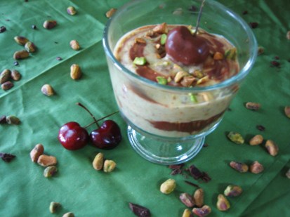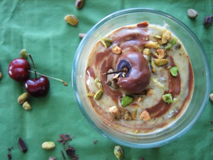 Pour half of the pistachio soft serve into a pretty glass, top with half of the chocolate, then repeat, gently swirling the chocolate at the top. Garnish with chopped pistachios and a cherry on top (optional). Fresh banana slices between the layers of soft serve are good too.