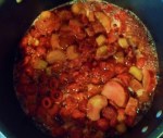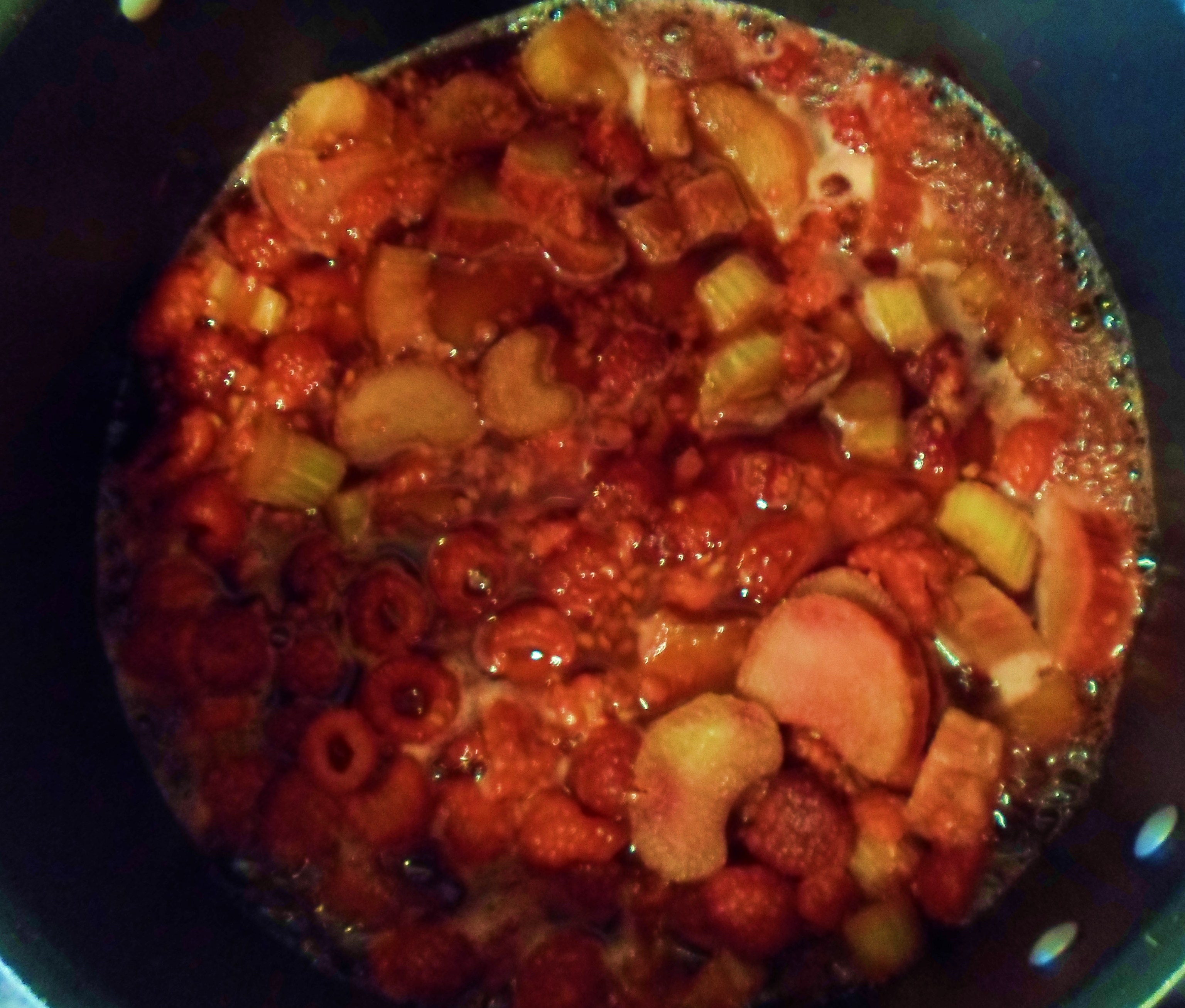Put raspberries and rhubarb in medium sauce pan with water, sugar and sea salt. Heat until it bubbles and simmer for one full minute.