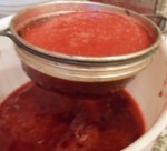 Strain into a bowl using a fine mesh strainer. I used a large tea strainer and did this in small batches. Occasionally scrape the strainer with a spatula to help facilitate draining, and also tap it on the side of the bowl to keep the juice pouring out of the strainer.