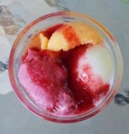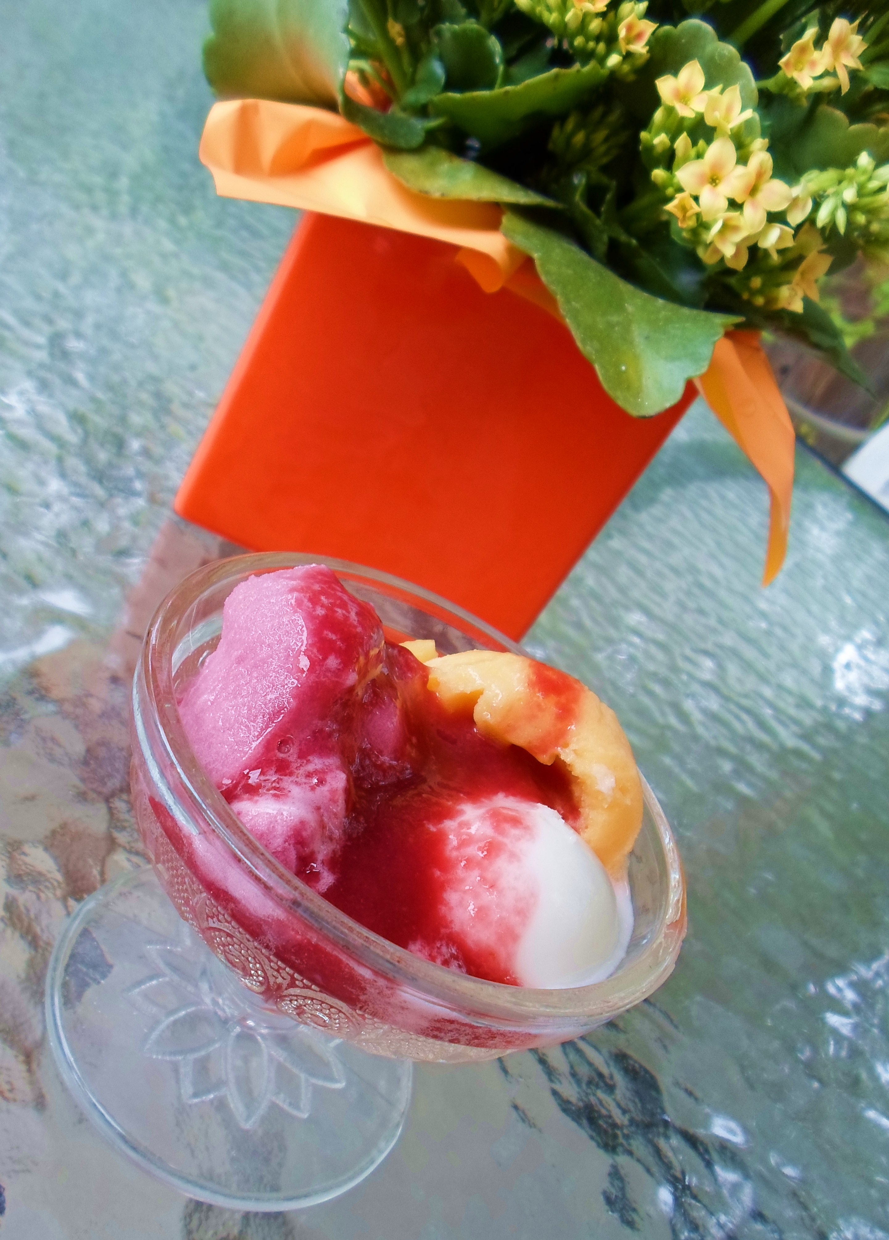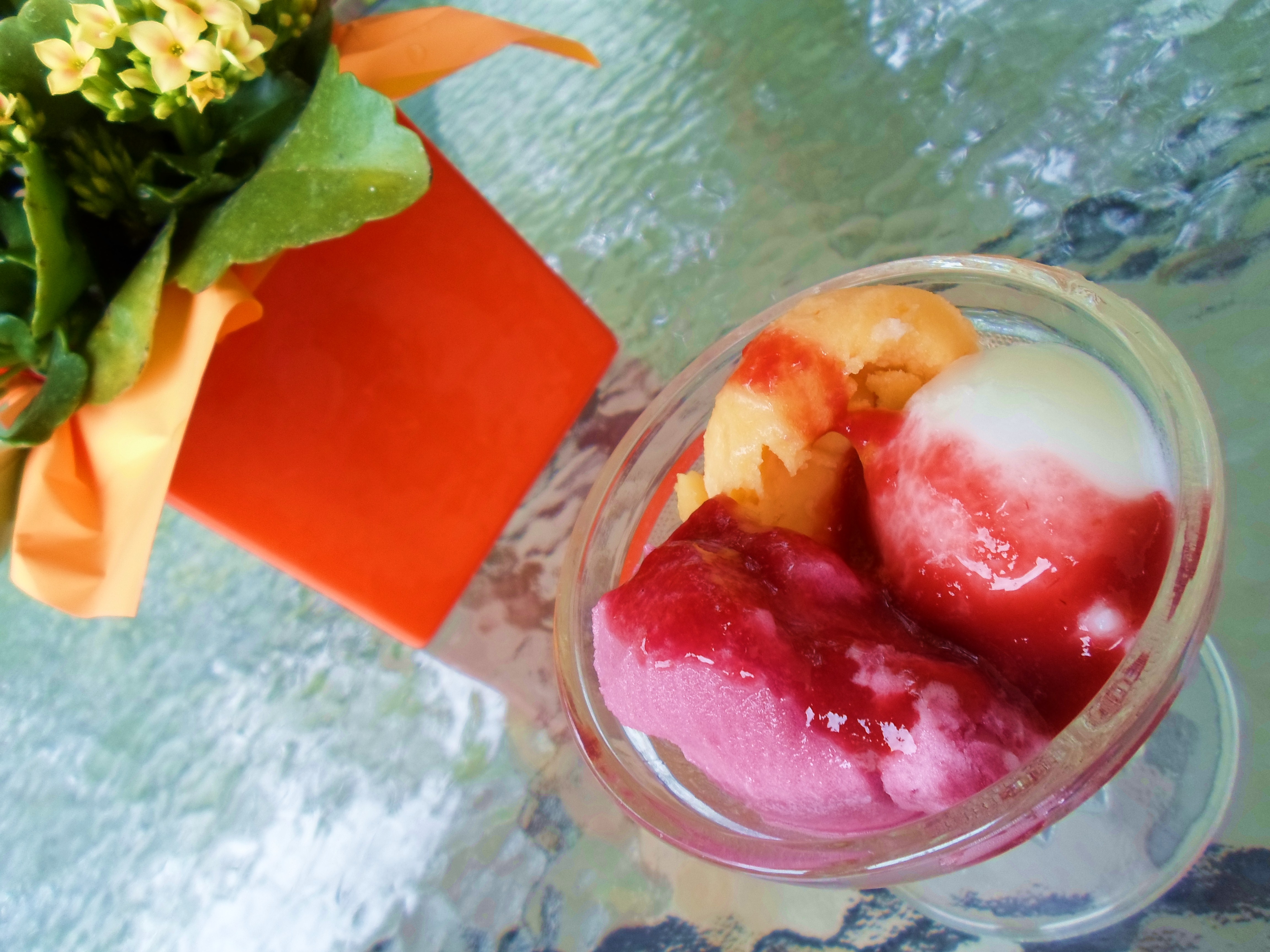 Fresh Raspberry Rhubarb Sauce (over Rainbow of Sorbets)