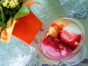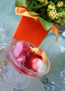 However, when we had company over, I did find a few minutes to create this lucious tart-sweet summer dessert sauce made from raspberries and rhubarb. It is a cinch make, even for Scrambled Mom-Brains, and looked beautiful served over a variety of sorbets. I just put the sorbets on a tray with scoops, let company serve themselves, and then passed the ruby red fruit sauce to allow for individual dolloping. Easy, refreshing, pretty and divinely delicious.