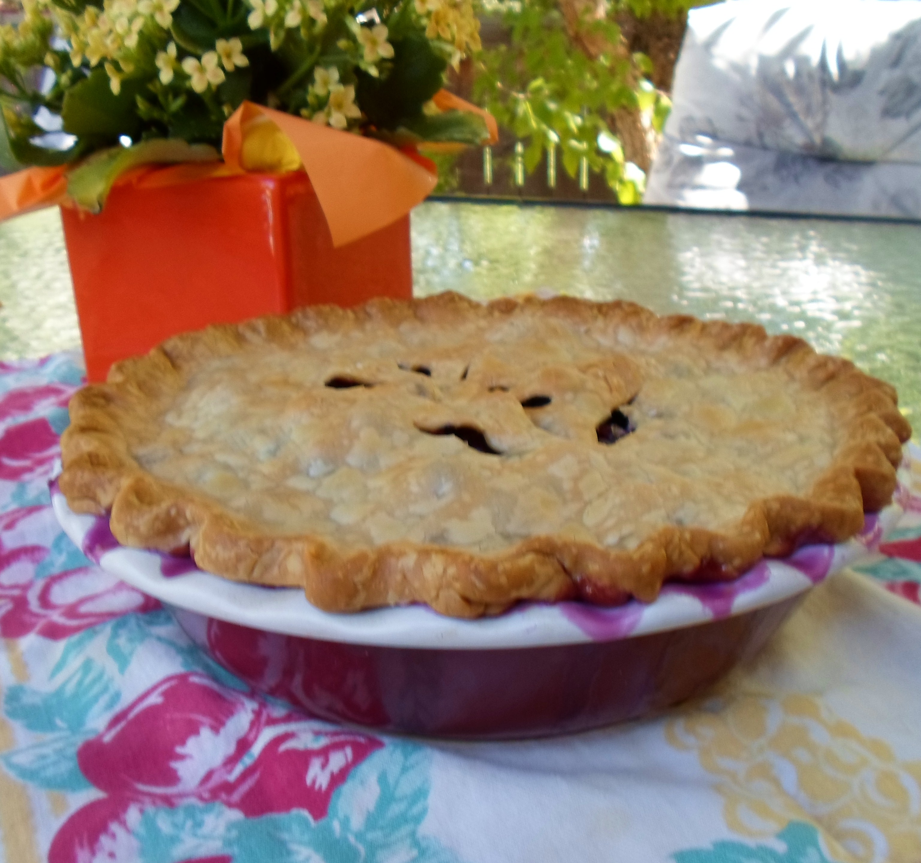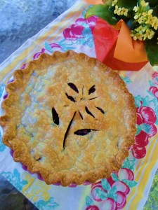 Bake at 400 degrees for 45 minutes or until golden brown. If edges begin to brown before pie is cooked, carefully and lightly crimp strips of aluminum foil around edges to keep it from getting too dark. I double test for “done-ness” by sticking a fork into an open slit. If it comes out coated, as if with syrup, it is probably ready. If the fork emerges dripping thin juice, it probably needs a few more minutes for the cornstarch and blueberry juice to combine and thicken.