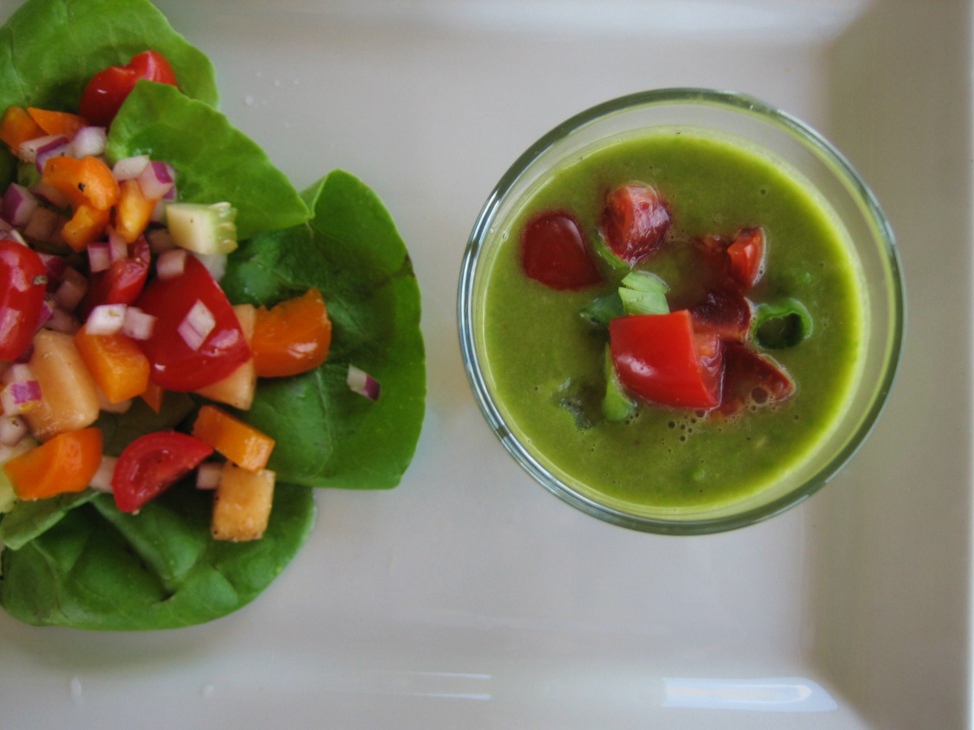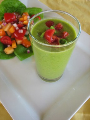 Sweet Pea Soup served chilled with Kickin’ Melon Cucumber Salad (https://welaughwecrywecook.com/2012/06/28/kickin-melon-cucumber-salad/)