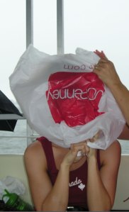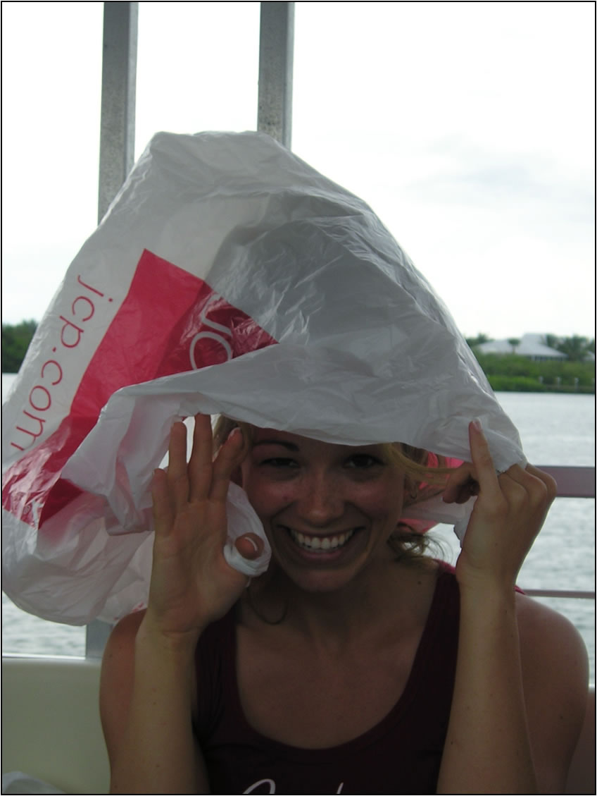 Jared and I married on this very island, exactly five years ago this Sunday. On our wedding day, there was a torrential downpour all afternoon and into the early evening. I had to go to the mainland to get my hair done up at the JCPenney hair salon in the local mall, the only salon opened on a Sunday in this small town. Before I realized what she was doing, the stylist, a tiny little woman with a thick  German accent, had teased my hair into an “old lady” beehive updo. Apparently, they don’t get many young brides in Retirement-Ville. Instructing my strong-willed German stylist on what I wanted was no easy task, but we finally tamed my wildly teased and over-sprayed hair into something presentable. As it turned out, it really didn’t matter. On the ferry back to the island, it was so rainy and windy, I was drenched by the time we docked. (Though my mom and I made a valiant attempt to salvage my do on the ferry boat back to the island, all captured on film by the wedding photographer.  That’s mom’s hand there in the picture on the left, holding the bag.  Lovely.)  Thankfully, once in our condo,  mom was able to fix my sagging upsweep just in time for the wedding.