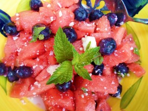 In a glass bowl, layer the watermelon, blueberries and feta, in that order.  Just before serving add the rest of the ingredients and toss very gently again. Serve.  Note:  If you are using frozen blueberries this dish is best served just a few minutes after the berries start to thaw, so they are still a little bit icy and hold their shape. In fact, I would just toss the frozen blueberries in last, and they should be ready for eating by the time people serve themselves and sit down to eat.