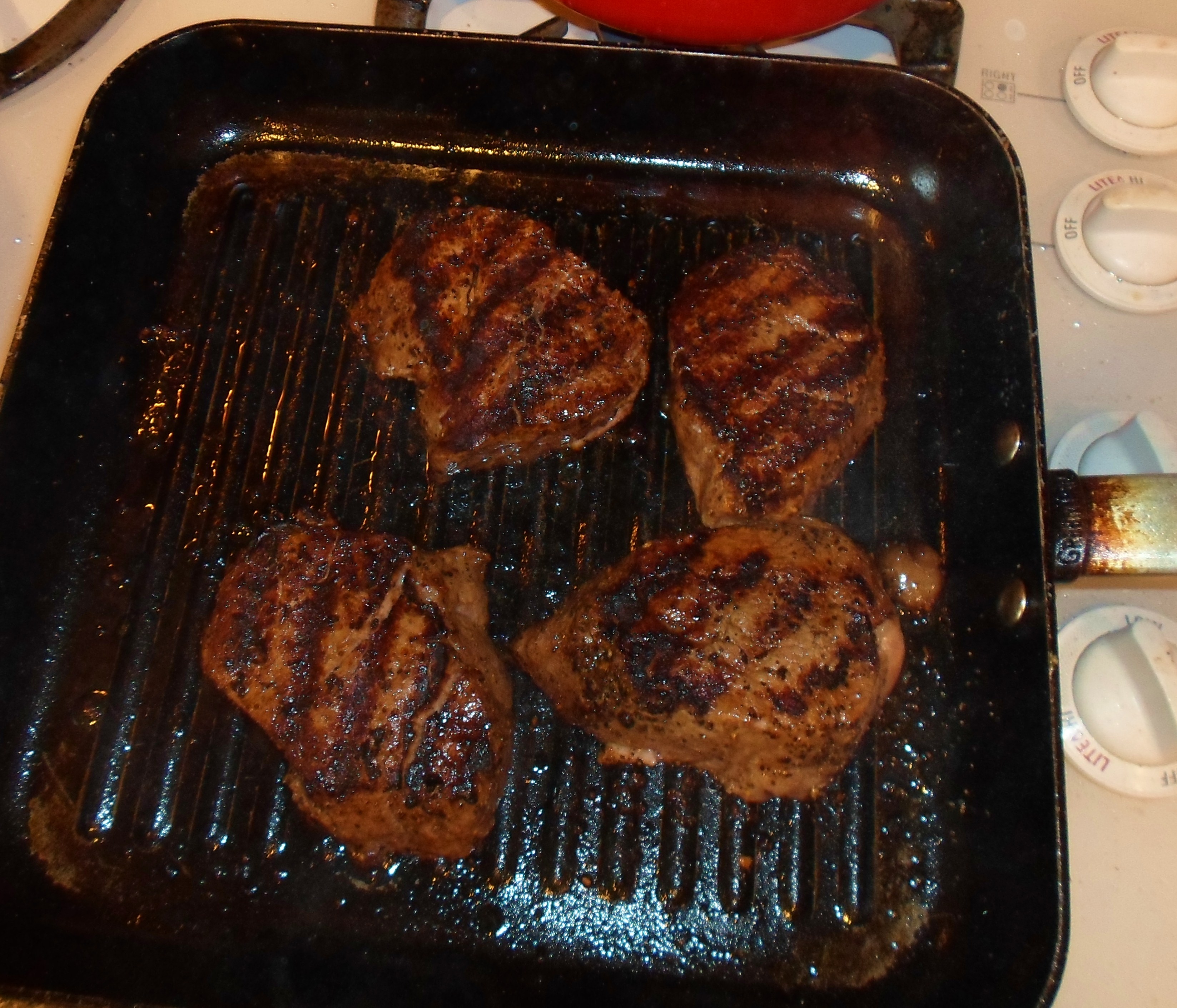 Put the steaks into the grill pan on high, and sear until the meat is golden brown with dark grill marks, just a few minutes. Turn the steaks over and repeat.