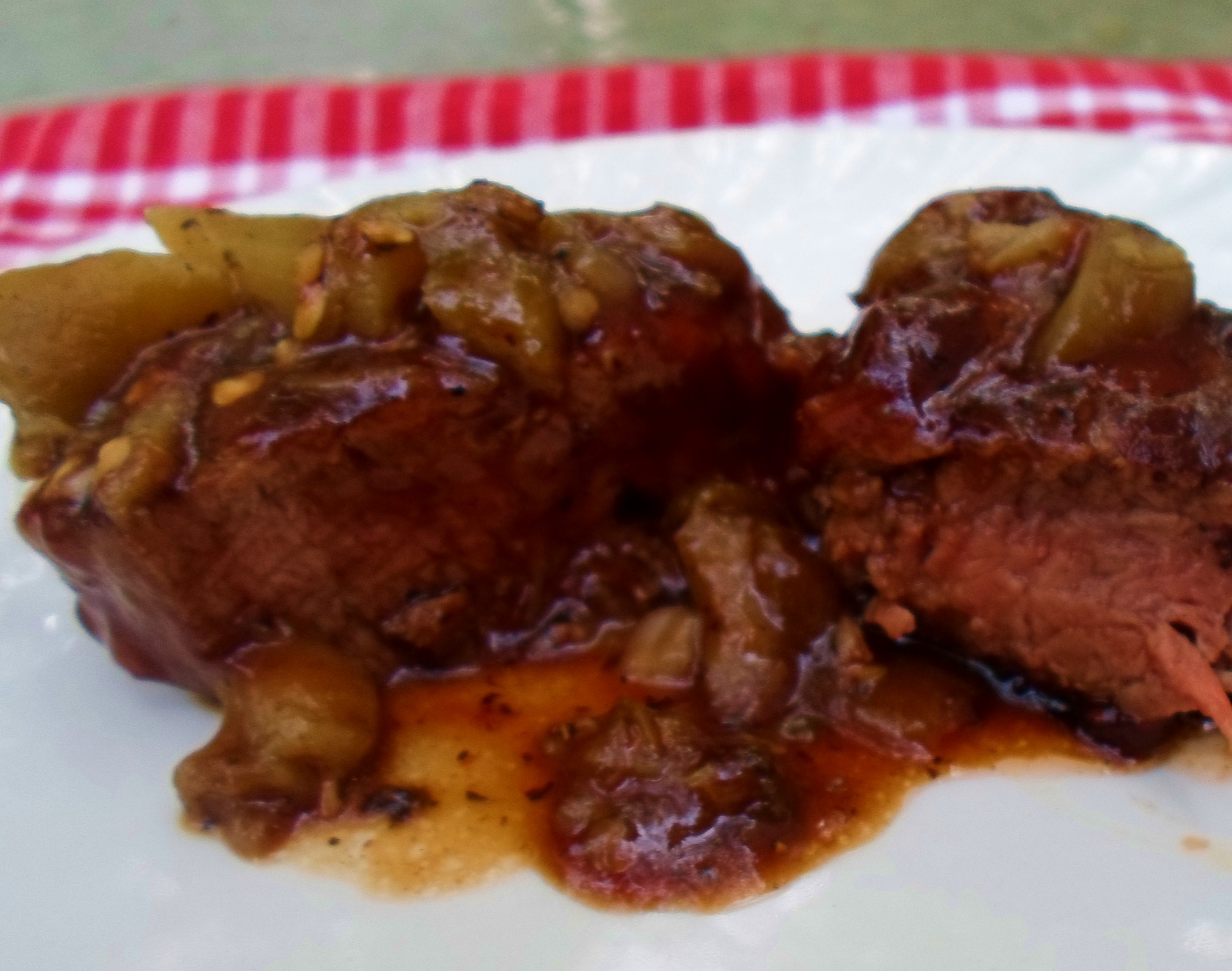 I am not a big ‘hunk of meat’ fan, as a general rule. I prefer meat as an appetizer with veggies and fruits taking up the bulk of my plate. But a petite tenderloin steak, cooked to medium rare perfection and topped with bar-b-que sauce and green chilis, a tender cut of meat that is incredibly juicy and slices like butter… well, this is hard not to love.