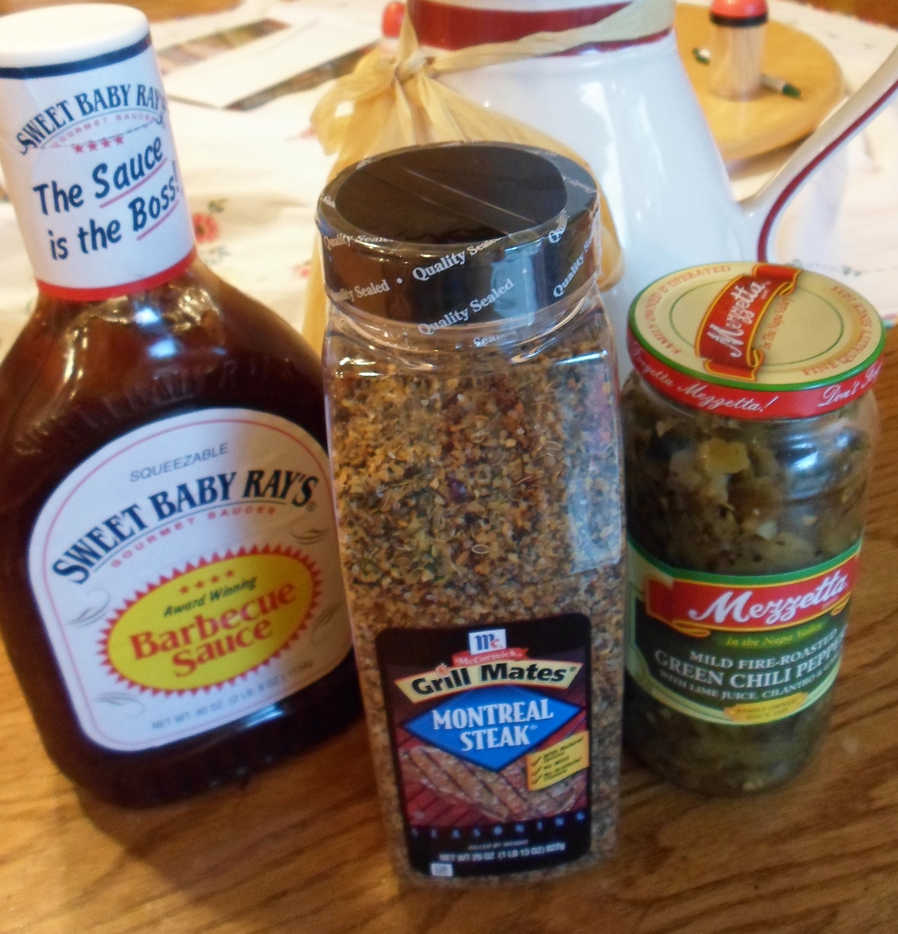 Sweet Baby Ray’s BBQ Sauce, Montreal Grill or Steak Seasoning, roasted chopped green chili peppers (In a jar! Love this new product)