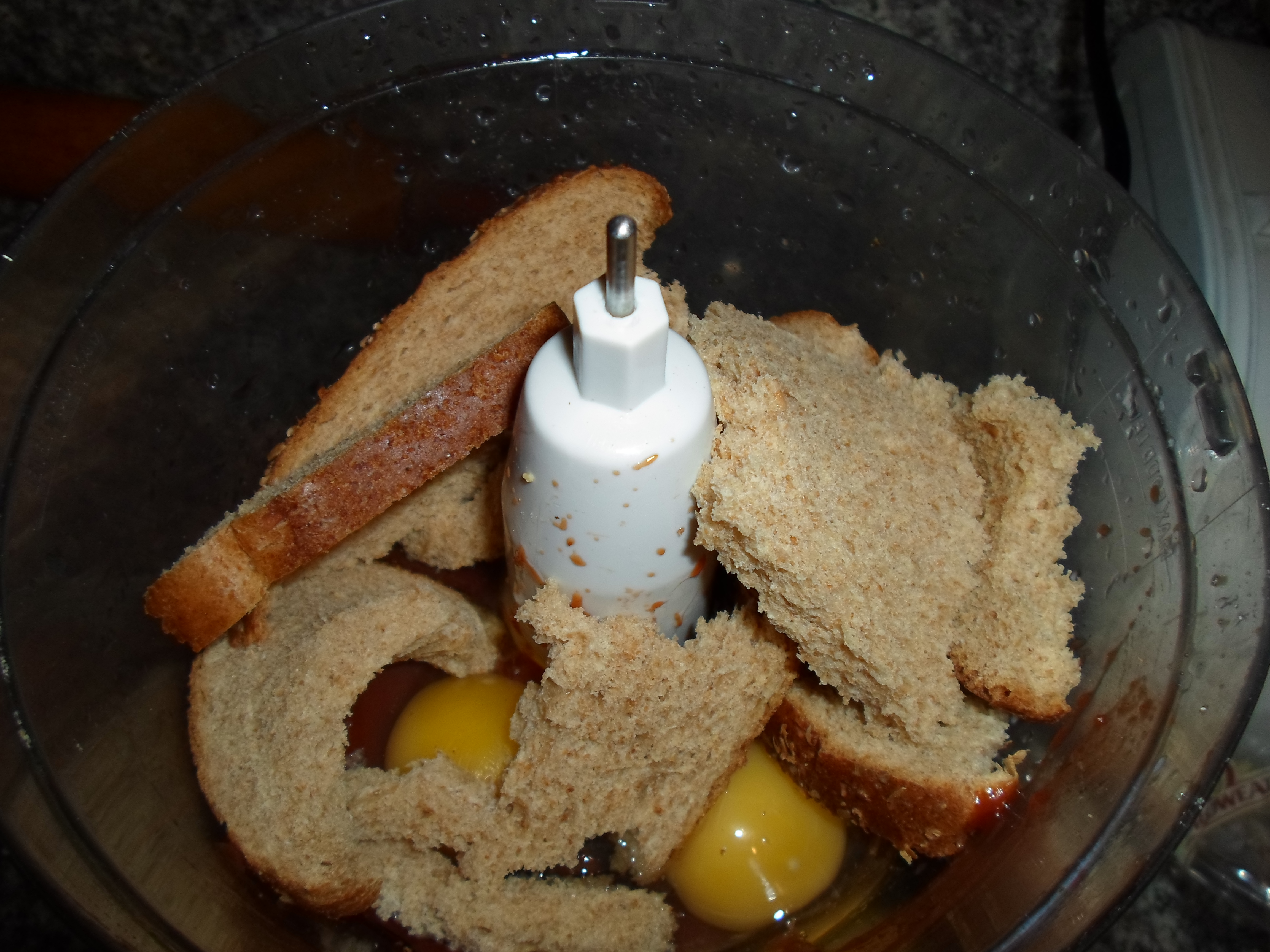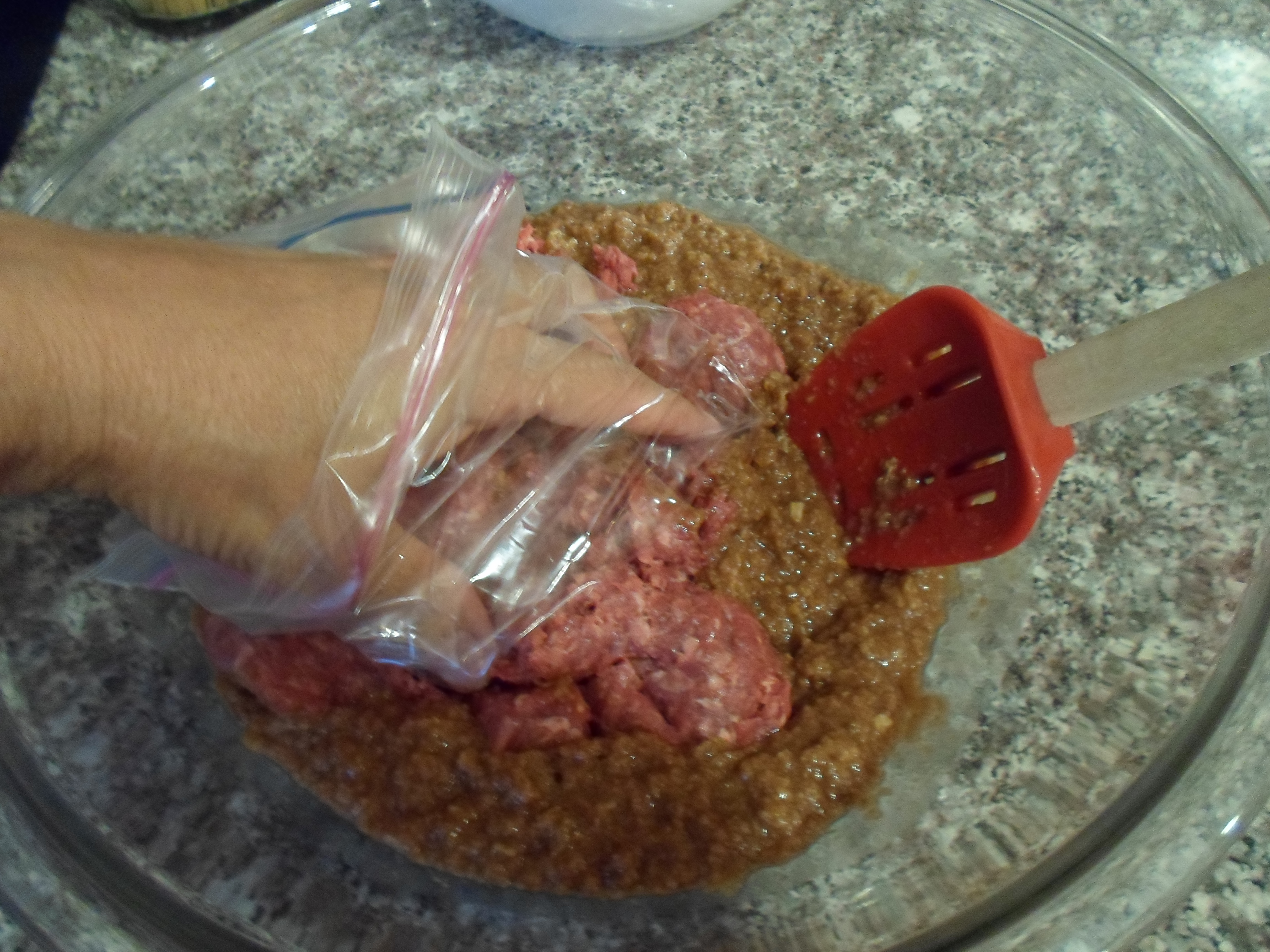 Using your hands (I put little disposable sandwich bags on them), work the seasoning-bread mixture into the beef.