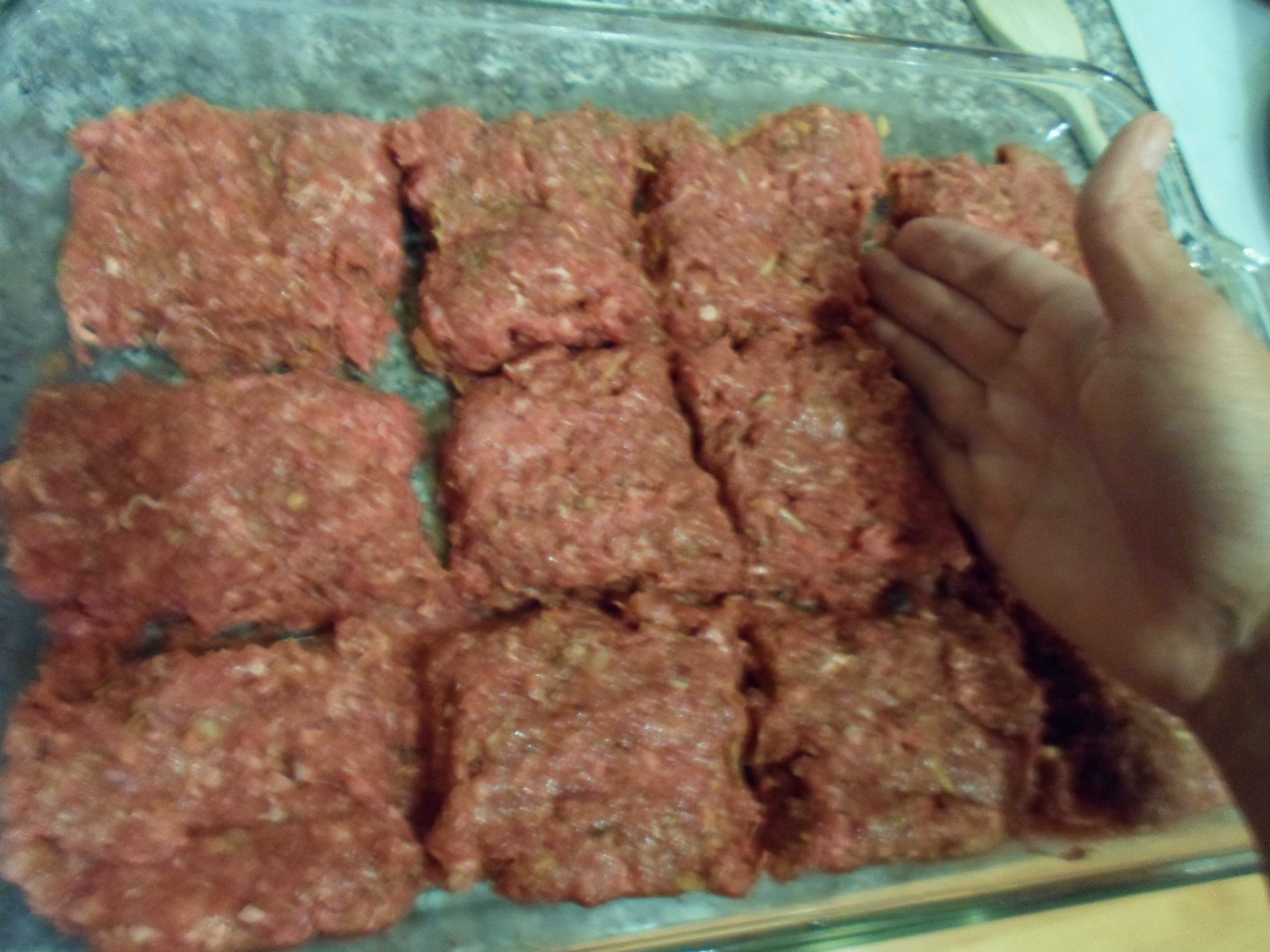 Using the side of your hand or end of a wooden spoon,  “cut” the flat loaf into equal “mini loaves.” It will look like little irrigation ditches alongside the  mounds of meat.