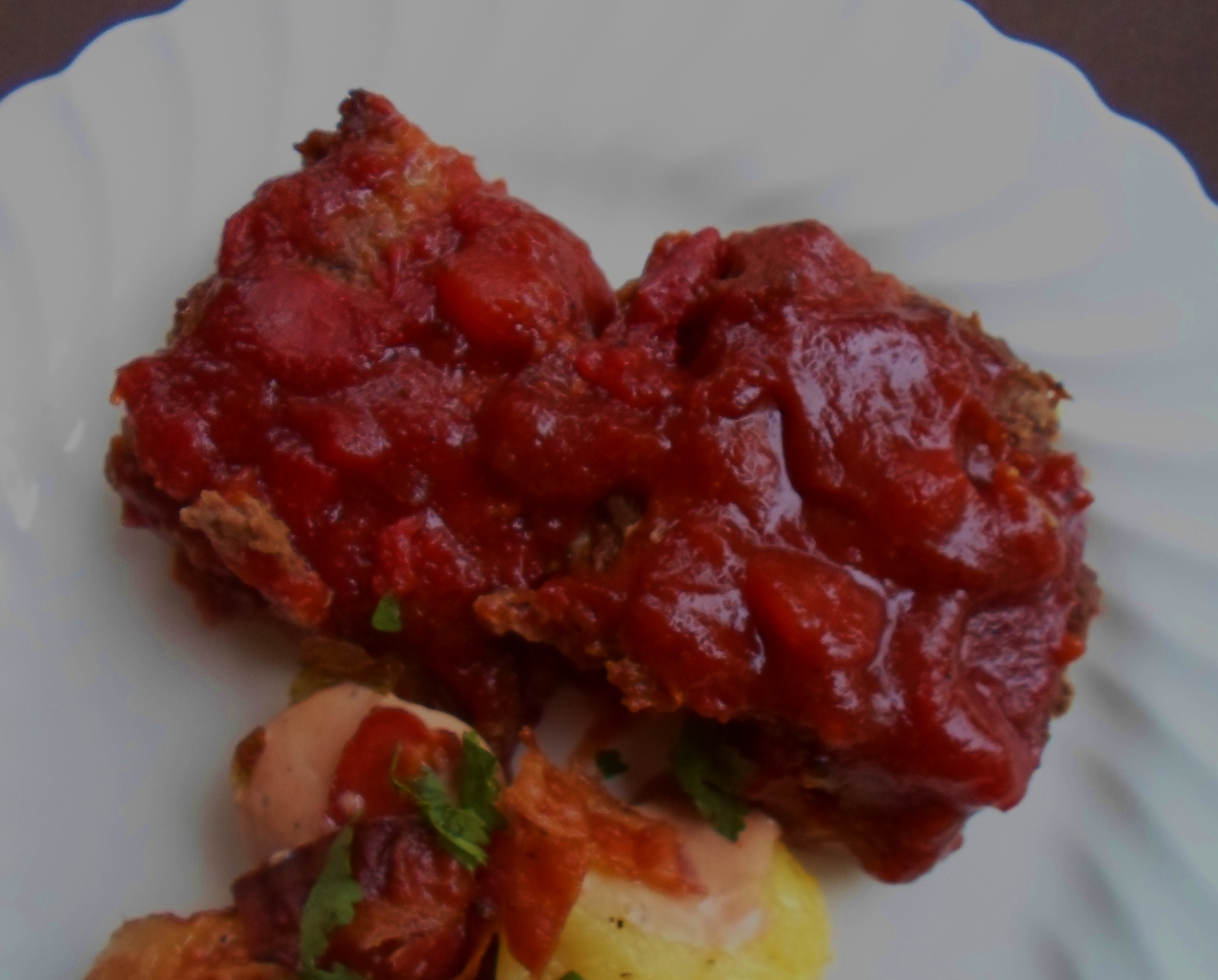 To me, most meatloaf never has enough sauce.   So I am generous with the rich sweet and spicy topping, and by cooking it in an oblong Pyrex pan, rather than a loaf pan, you get a more generous sauce-to-meat ratio.  When you separate the seasoned meat into small sections before baking into mini-loaves, it also cuts the cooking time in half and the meat is cooked uniformly, all the way through.