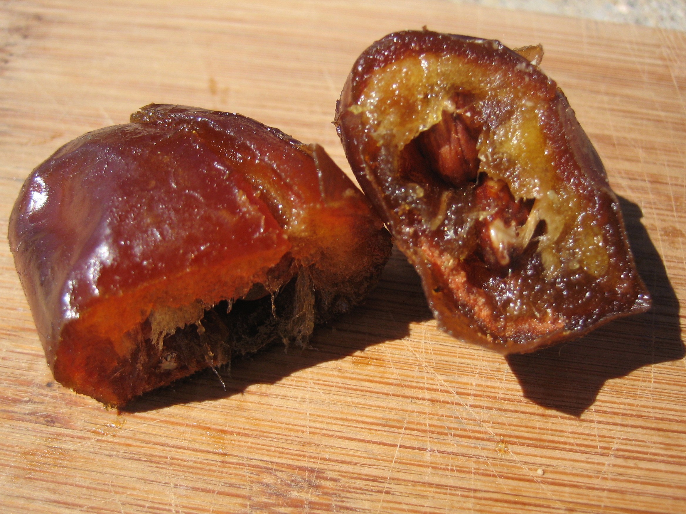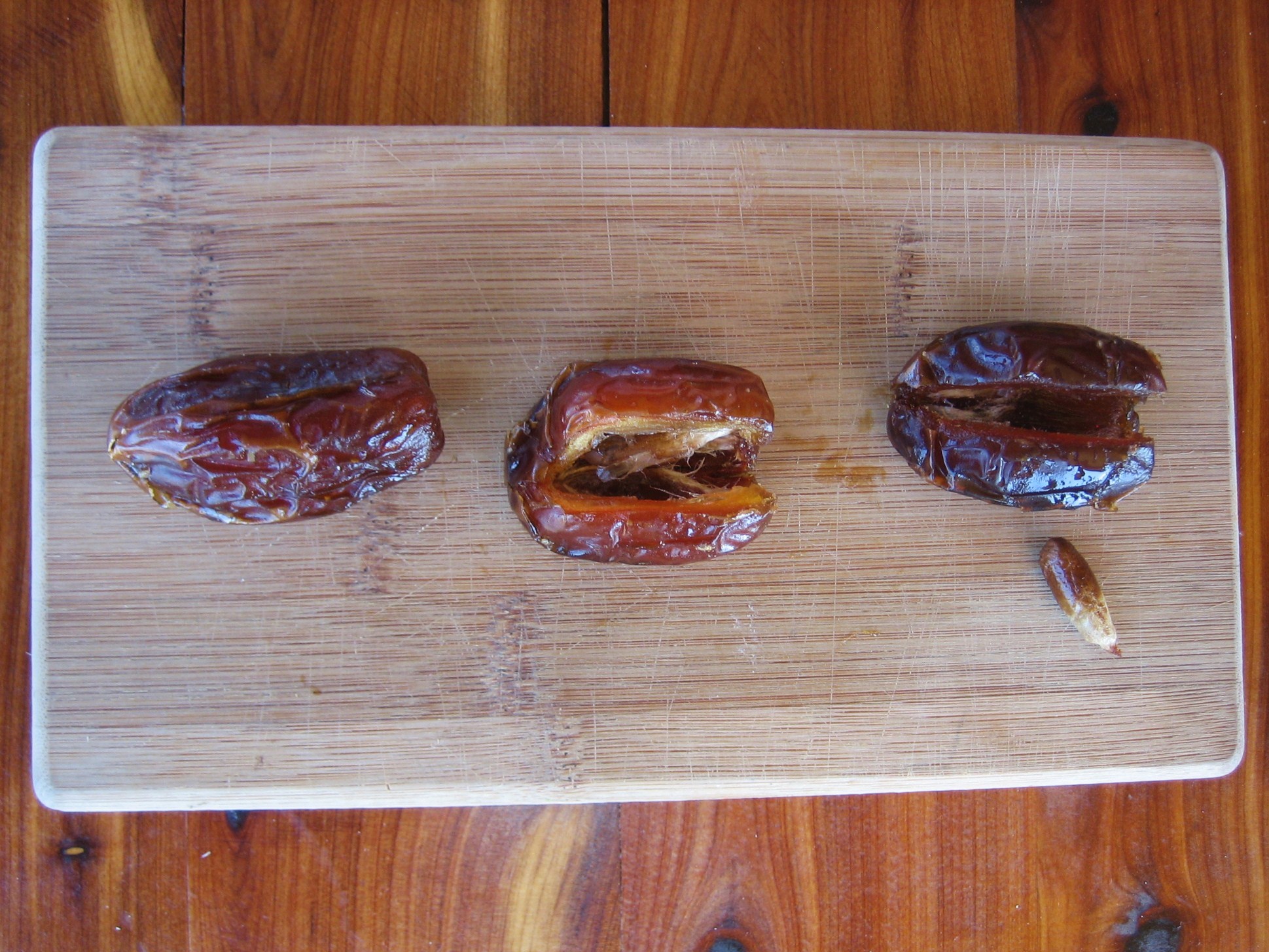Cut a slit down the side of the date and pop the pit out.