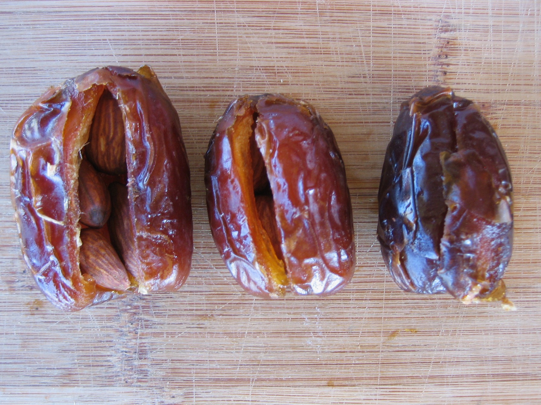 Generously stuff dates with roasted almonds and reseal the slit (dates are sticky, so it just sticks back together)