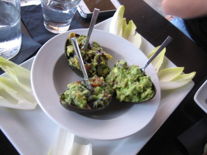 We started with the Stuffed Avocados with Endive, a trio of avocado halves, each stuffed with a different flavor combination: Italian, Southwest, and Waldorf. I would never have thought to mix avocado, blueberry, and candied walnuts together, but it was delicious. We expected the Southwest to be our favorite, but the Italian actually took both of our votes. Again, I don’t think of Italian when I think avocados, but the sun-dried tomato, basil, and almonds married wonderfully with my favorite fruitable (fruitable: word I just coined for a “vegetable” that’s really a fruit).