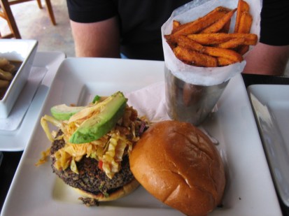 The Quinoa Burger topped with avocado and chile-lime slaw, served with sweet potato fries. A nice thick patty made with the super healthy grain. I was surprised how well quinoa worked as a veggie patty, it wasn’t mushy or crumbly at all.