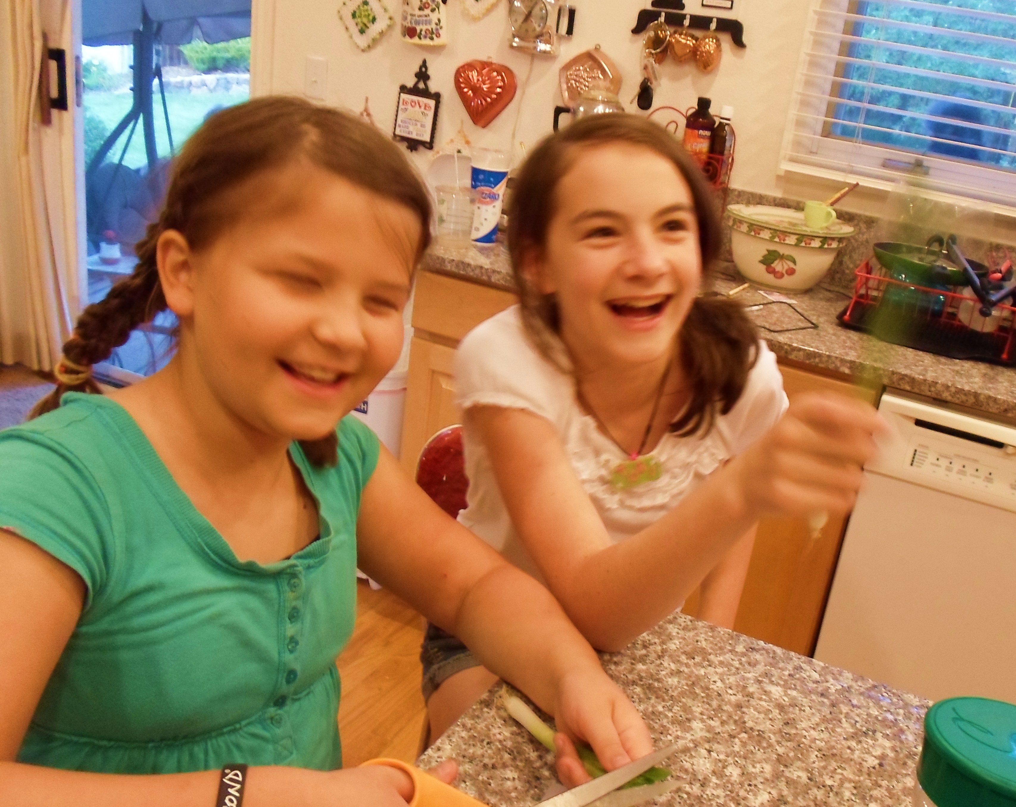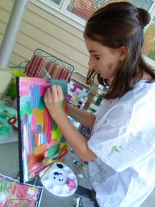 Yesterday, I let the girls paint pictures outside under our tree and beach umbrella, and then made them each virgin cocktails. (Cranberry Sprite, OJ and slices of lemon, lime and orange on ice.) Whitney took one sip and said, “This is delicious! In fact, it is as good as meatloaf!” I wonder how many bartenders have had compliments like that. “This Long Island Tea is as tasty as meatloaf!” Gotta love kids.