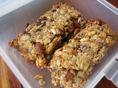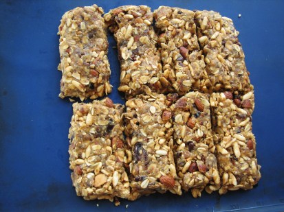 I made my own granola bars today that I feel completely fine sharing with my toddler and that my husband can feel truly manly about eating. They are gluten-free, dairy-free, and soy-free and have almost 8 grams of protein per bar. The only sugar is 1 T. of honey and 2 dates for 8 bars.