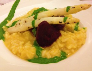 Pretty Vegan Appetizer of risotto, white asparagus, beets and pesto