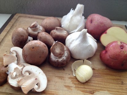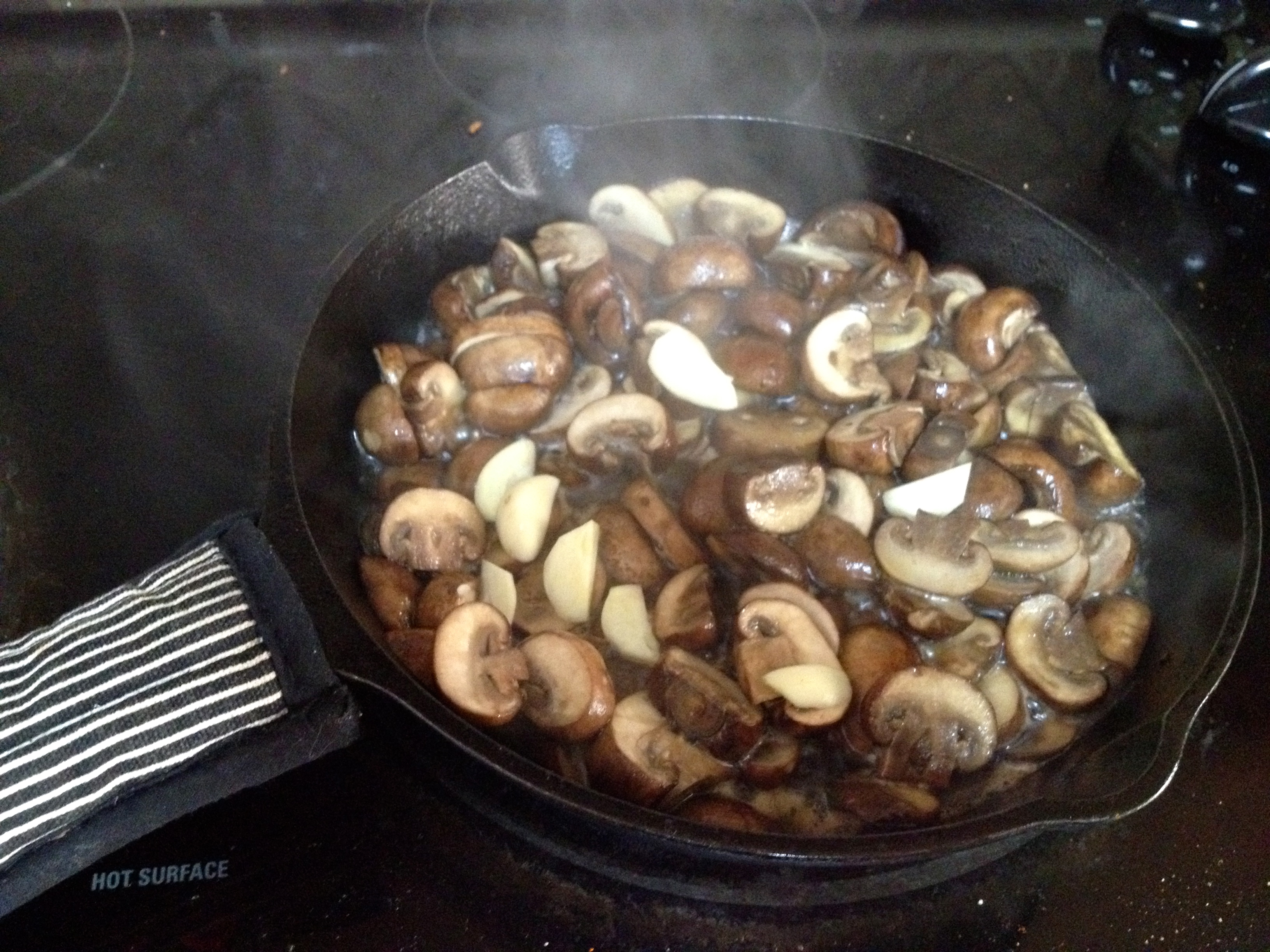 Heat olive oil on medium heat in a skillet, add mushrooms and stir occasionally until they soft and browned. Add garlic and a pinch of salt, saute until garlic is translucent. (Hint: Smash unpeeled garlic with the side of a wide chef’s knife to quickly pop off the peel and smash the clove simultaneously.)