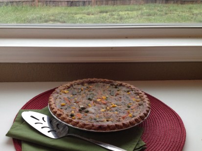Yes, today was a two park kind of day, a soak in the sun and giggle at my crazy kid kind of day. This weekend we had our first rainy cold front, though. It was a cuddle up and eat a bowl of warm soup kind of weekend. On Saturday, I sauteed up a whole bulb of garlic and a pound of mushrooms for a big batch of creamy potato soup. And on Sunday, I combined two of the coziest most comforting recipes, pot pie and shepherds pie, and made a topless veggie pot pie using the potato soup as the filling.