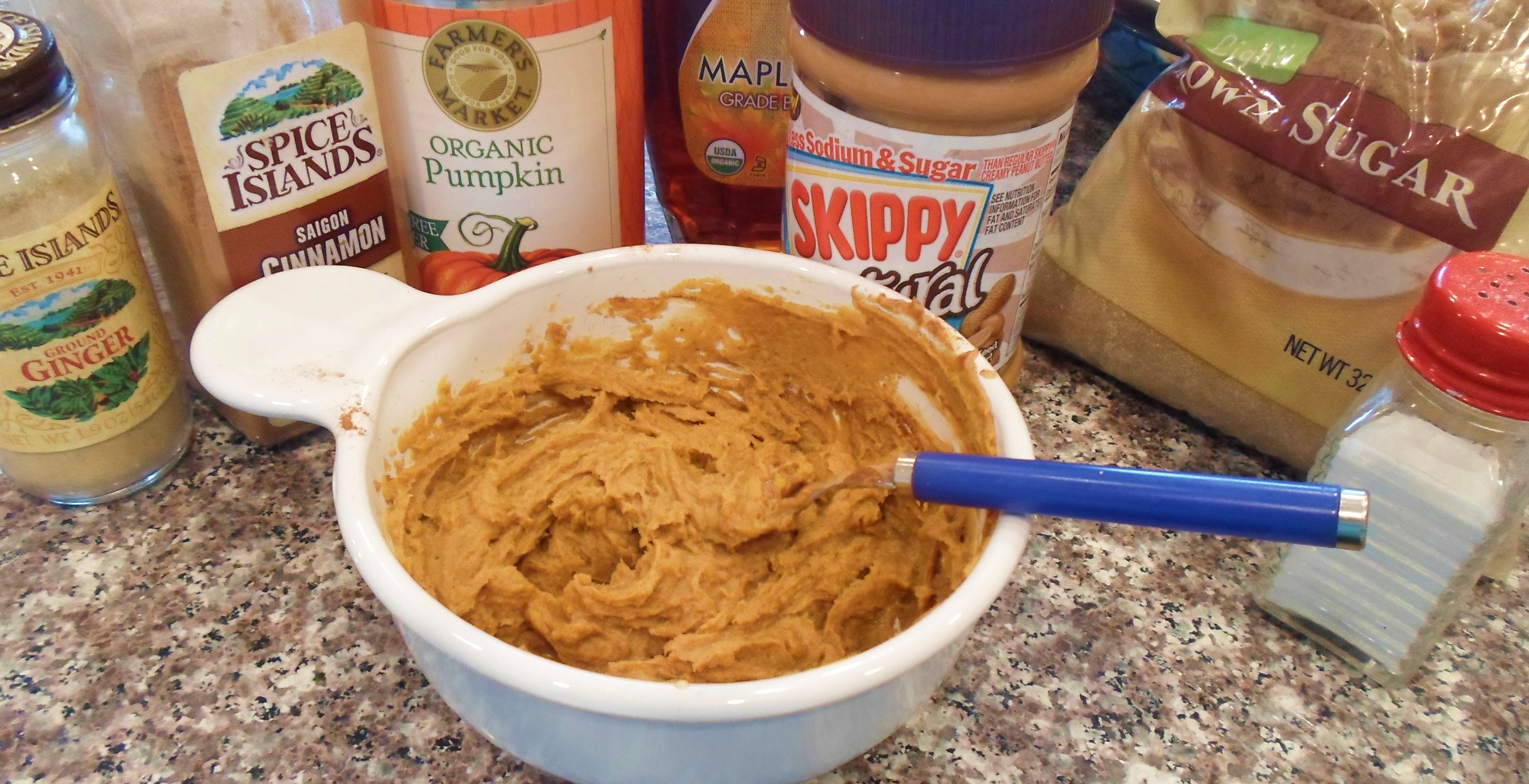 Mix the next 7 ingredients until smooth with a fork in a small bowl. Spread the pumpkin-spice peanut butter on the toast and assemble the turkey. (I used a large dried cherry for his wattle.)