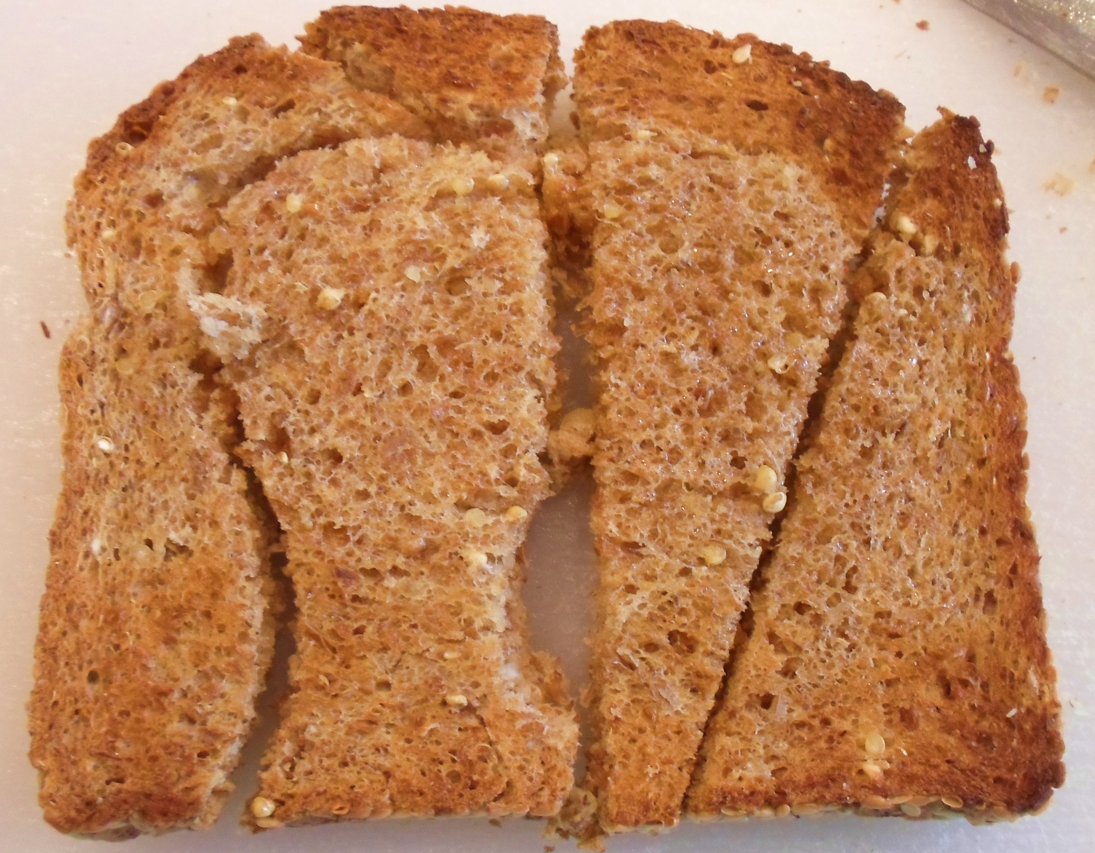 3 pieces of bread (I used Ezekiel Sesame Bread), buttered and toasted (Vegans can use Earth Balance butter)