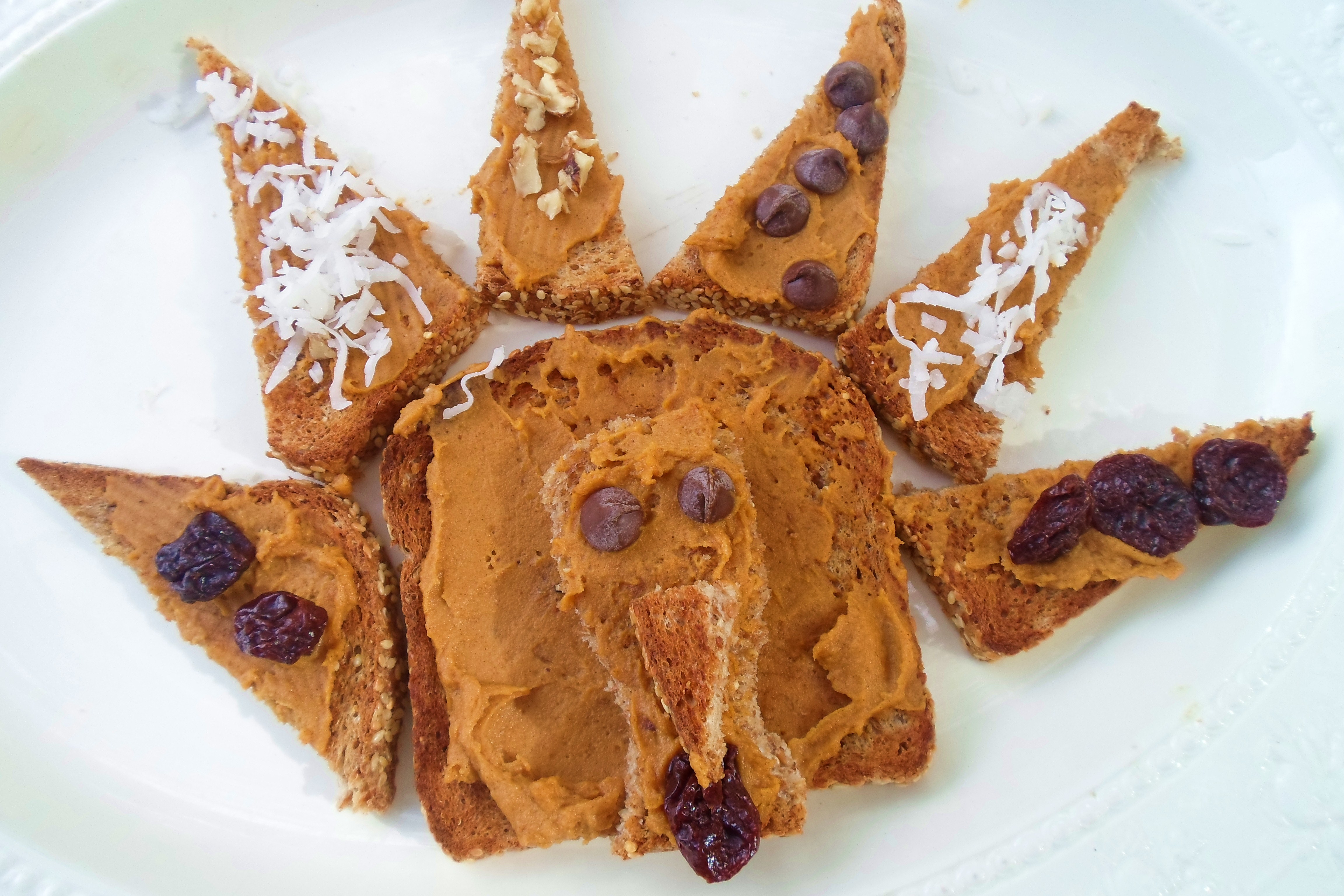 The toast is slathered with a simple pumpkin spice peanut butter, then after you cut it into the desired shapes to create either a pumpkin or a turkey, the kids can smear it with the pumpkin butter and decorate it with a variety of nuts, dried fruit, chocolate chips or marshmallows.
