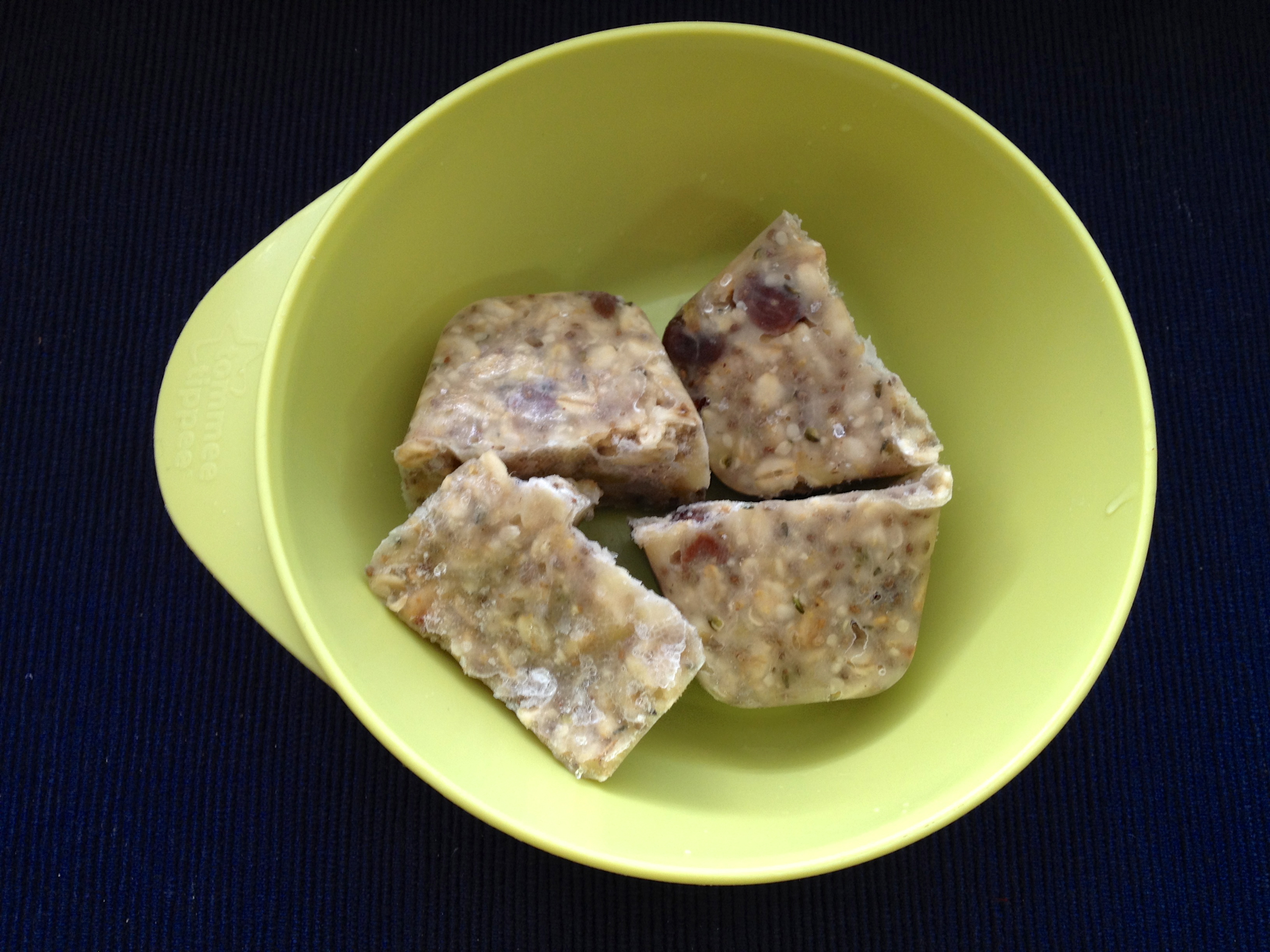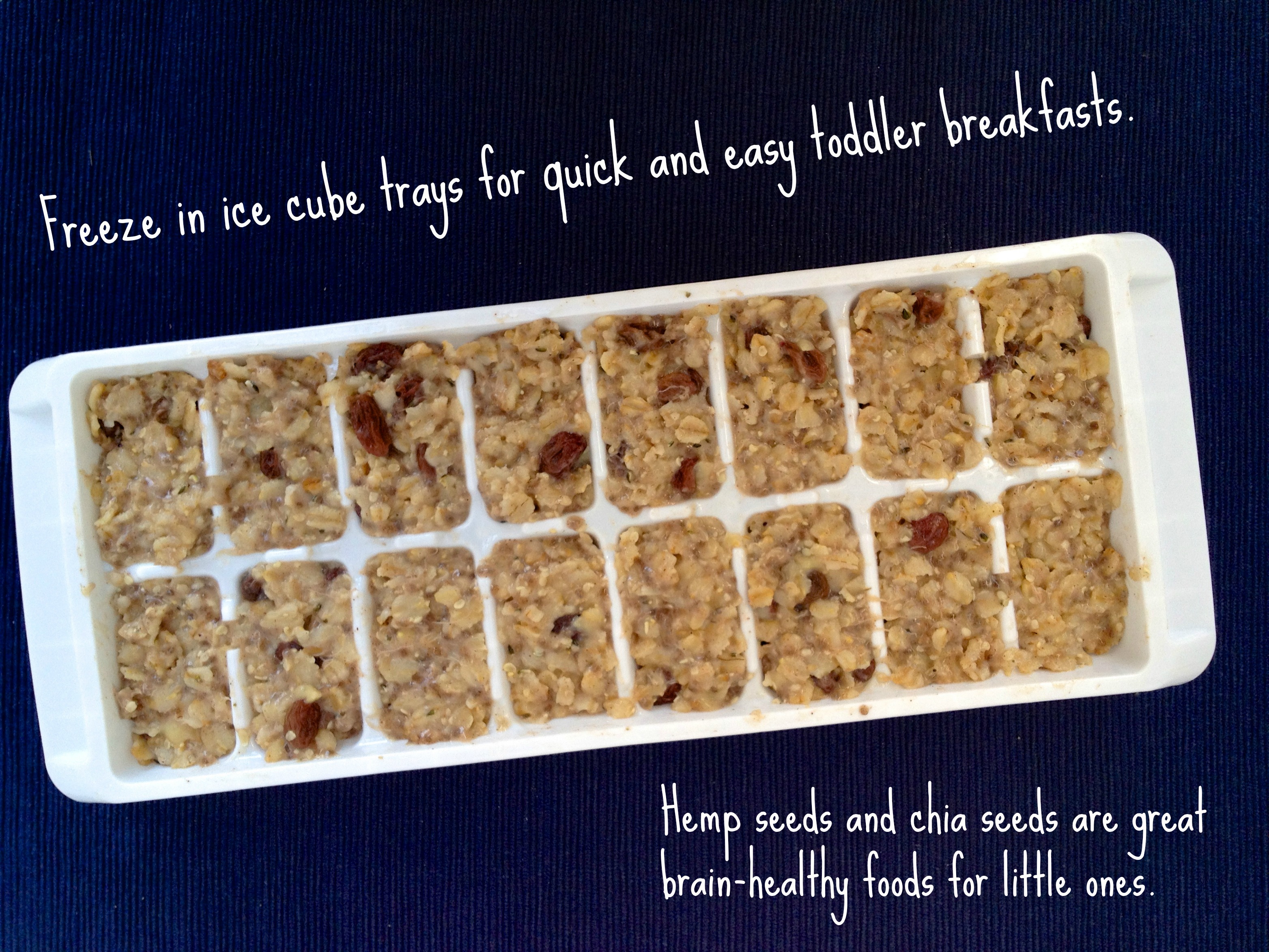 I made this batch this morning and served Jared, Jackson, and myself a bowl. What was left filled 1 1/2 ice cube trays  (about 24 cubes). Just scoop it onto the tray and with a spoon or spatula, spread it out evenly among the cubes, pressing down gently to make sure it’s packed firmly. Cover tightly with plastic wrap and freeze. Once frozen, pop out and transfer to freezer bags.