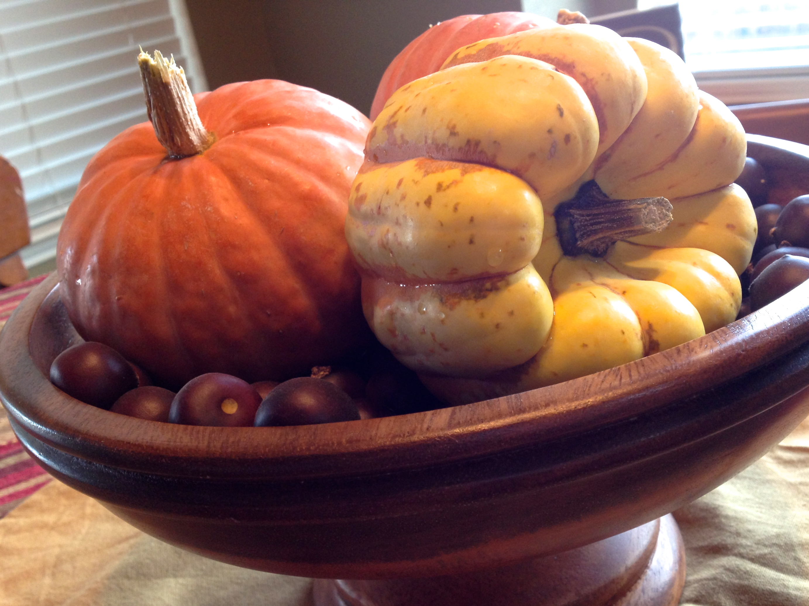Every year around this time I make one of my favorite fall recipes with the pretty squash I’ve used to decorate my house. The centerpiece takes center stage in one magnificent dish with all the flavors of Thanksgiving–sage, apples, pecans, cranberries, squash, toasty bread stuffing. Sometimes I make it on Thanksgiving day, but we are traveling to my mom’s this year, so we had our annual stuffed squash fall celebration this weekend.