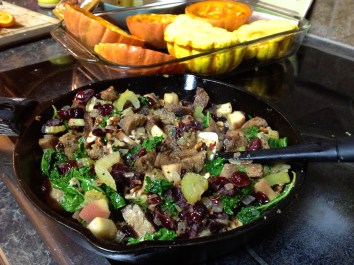 Step 4. In the same hot skillet, lower heat to medium and add a little more olive oil. Add the onions and celery and a pinch of salt.  Stir occassionally until onions and celery are soft. Add the apples and kale. Saute until they are soft. Lower heat and stir in sausage, pecans, drained cranberries, clementine or orange juice, and season with salt and pepper. Remove from heat.
