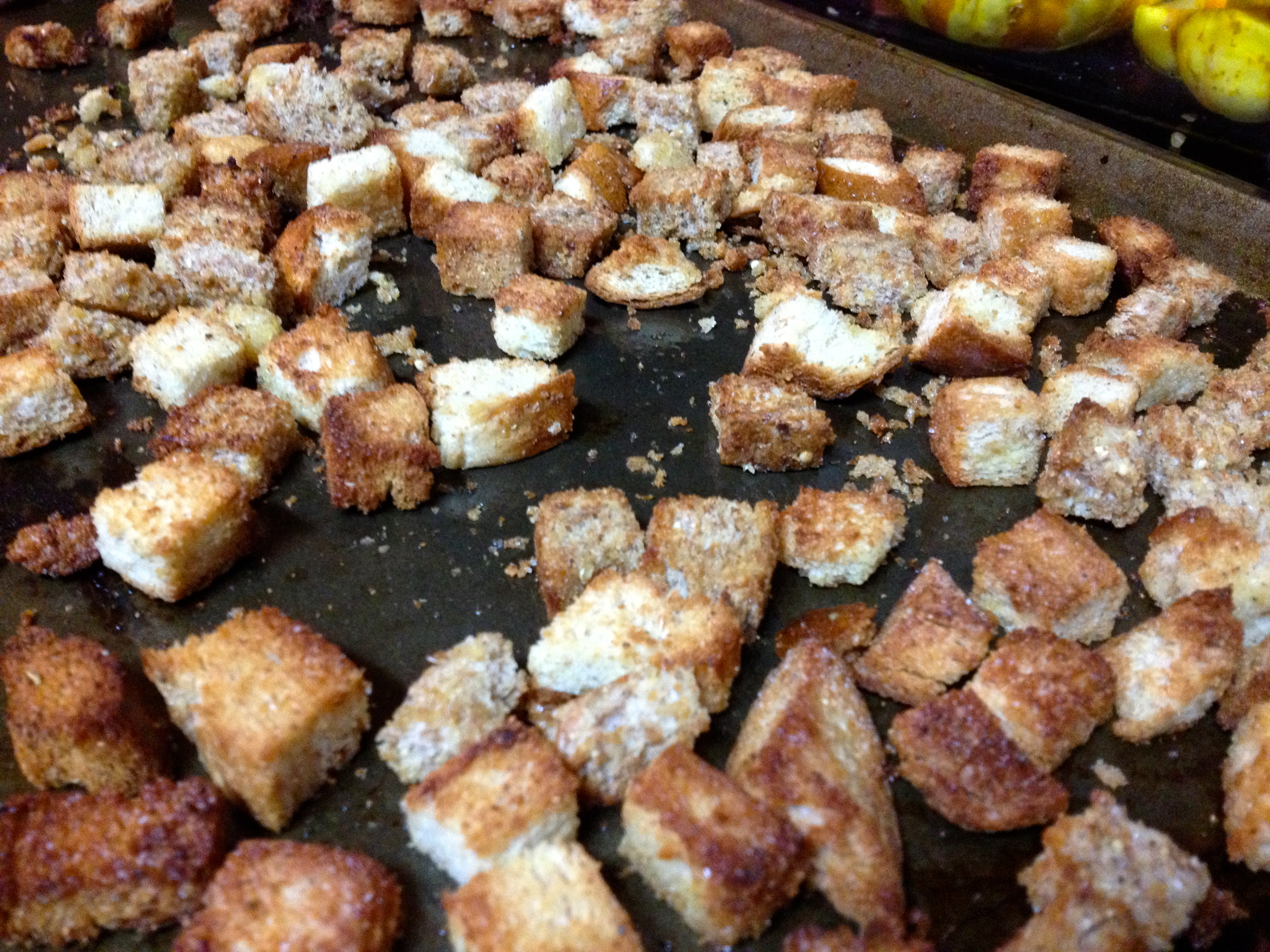 I used a mix of stale white bread and Ezekiel bread to make the croutons.