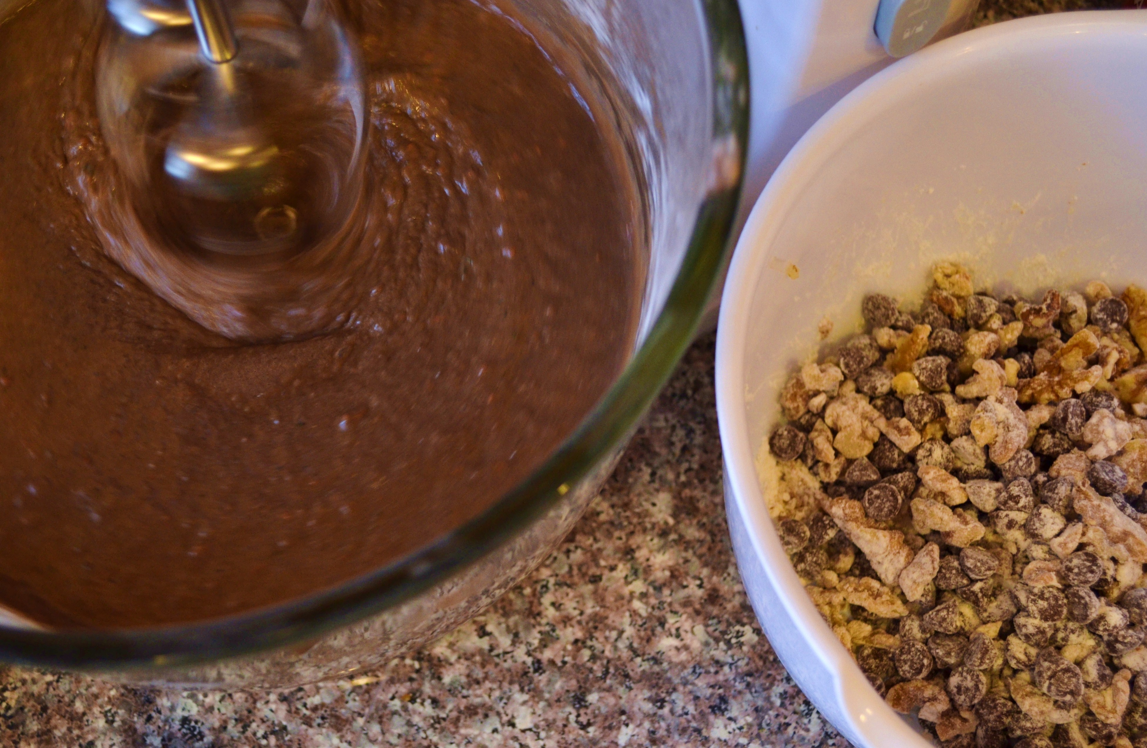 So I started tweaking and baking like one of those OCD chefs from America’s Test Kitchens.  By the time I was done, I’d changed every ingredient and added more, and made the recipe entirely my own. I don’t like the taste of baking soda so I switched to baking powder. It wasn’t chocolately enough so I used dark Hershey’s cocoa, added ¼ cup Hershey’s syrup and doubled the chocolate chips. I added a cup of chopped walnuts.  I substituted ½ the zucchini for grated carrots because that’s what I had in the fridge.  (Actually I just put all the veggies in the food processor and whirled them.I’ve no patience for hand-grating veggies and I value my knuckles.)