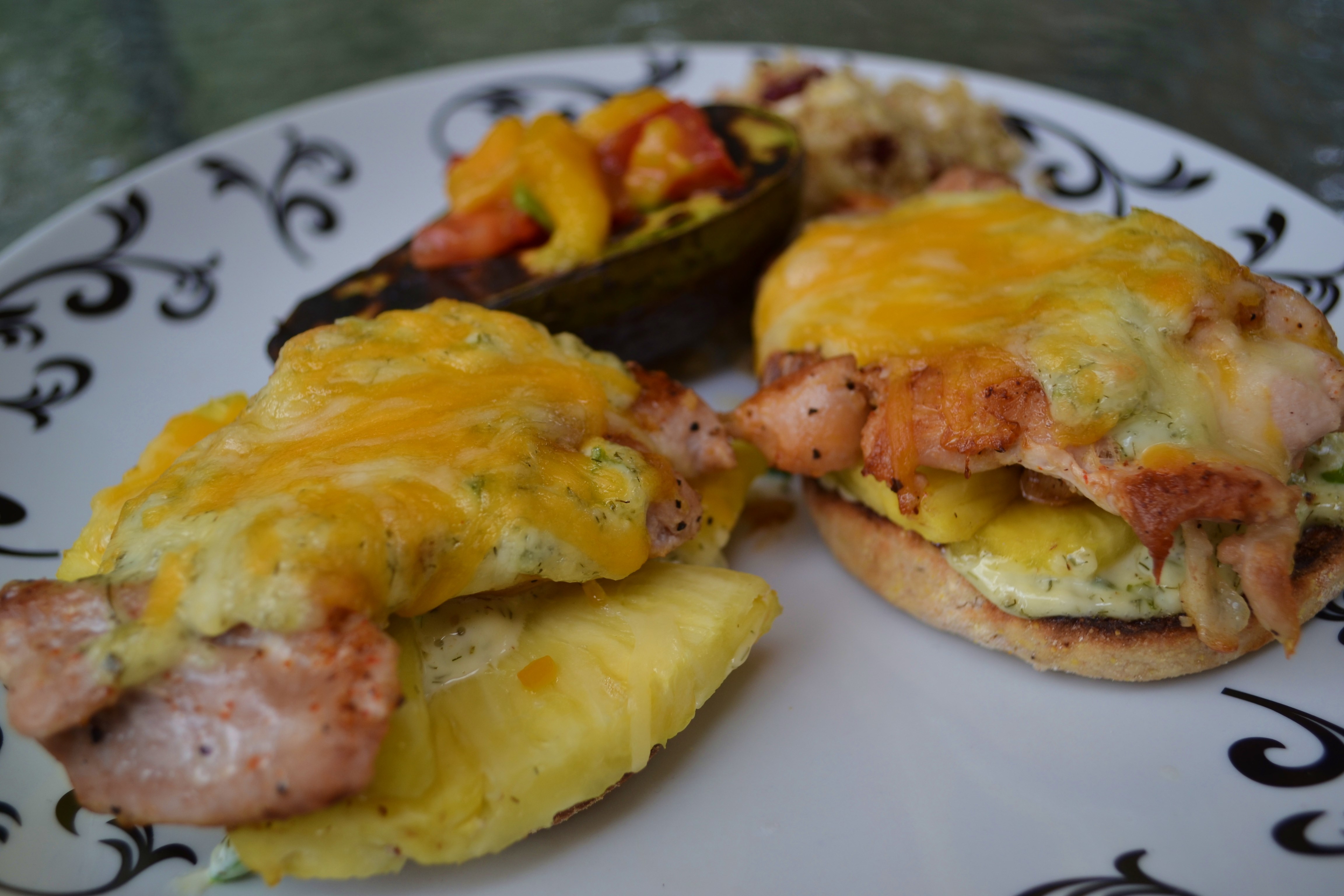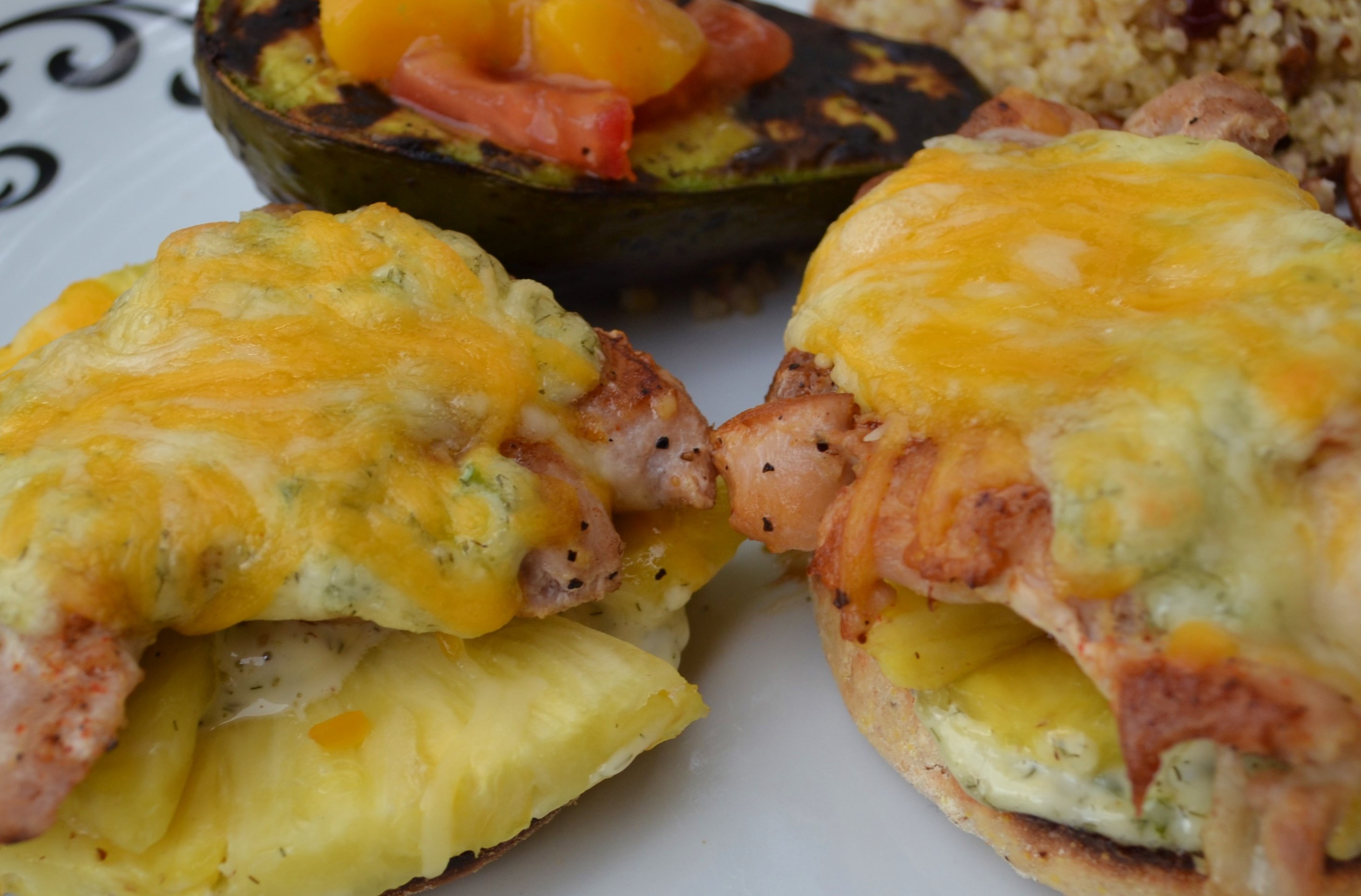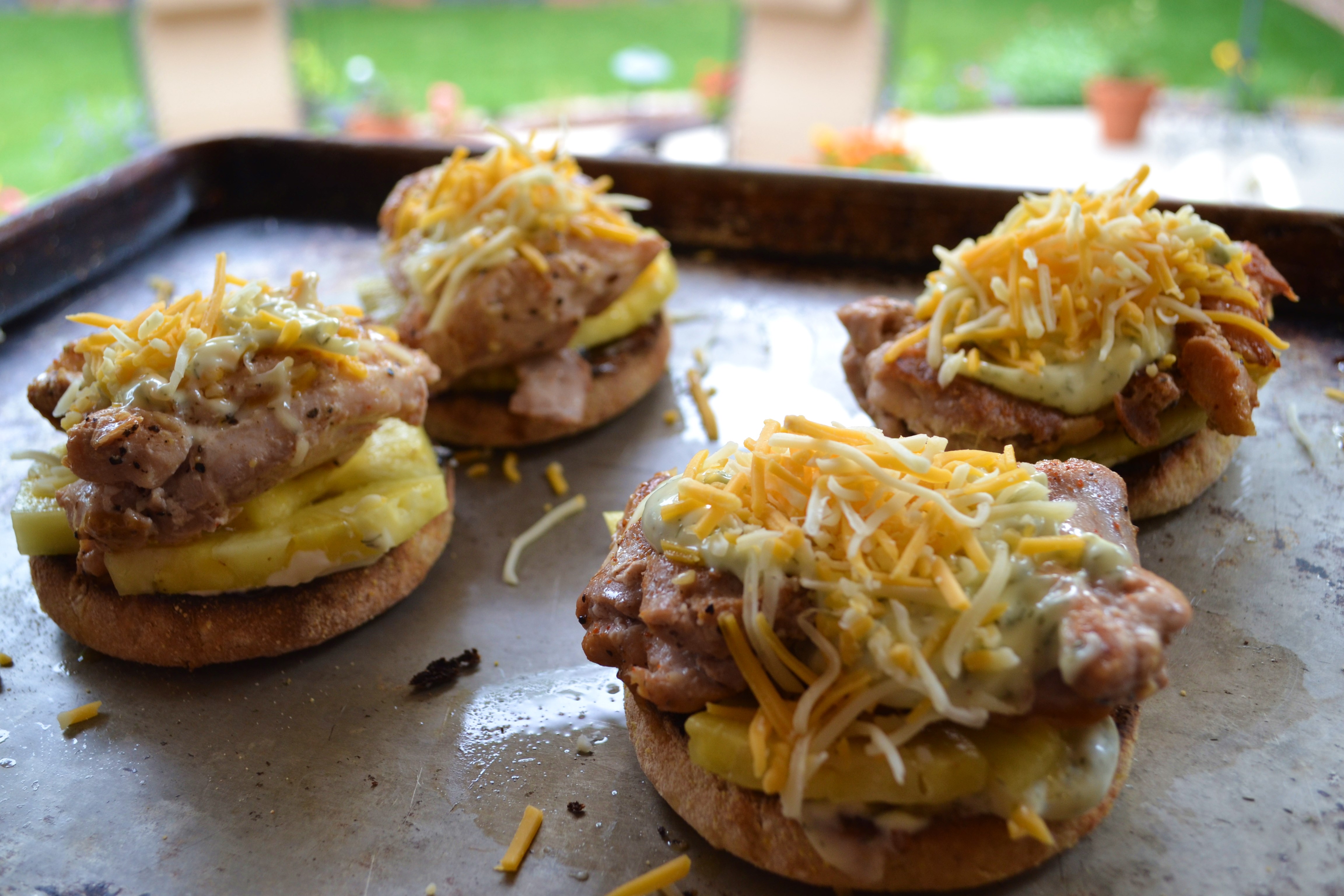Mix mayo, green onions and dill together in a small bowl.  (Don’t skip the dill, it is truly what makes this dish special!) Spread the toasted muffin halves, cut side up, with a heaping Tablespoon of the may0-dlll-onion sauce.  Place the muffins on a cookie sheet or large baking pan, leaving at least 2 inches between them.  Next, place a slice of pineapple on each muffin.  Then carefully lay  one piece of boneless cooked chicken on top of the pineapple, followed by another scant tablespoon of mayo-dill-onion sauce and finally a heaping tablespoon of grated cheese on top of it all.