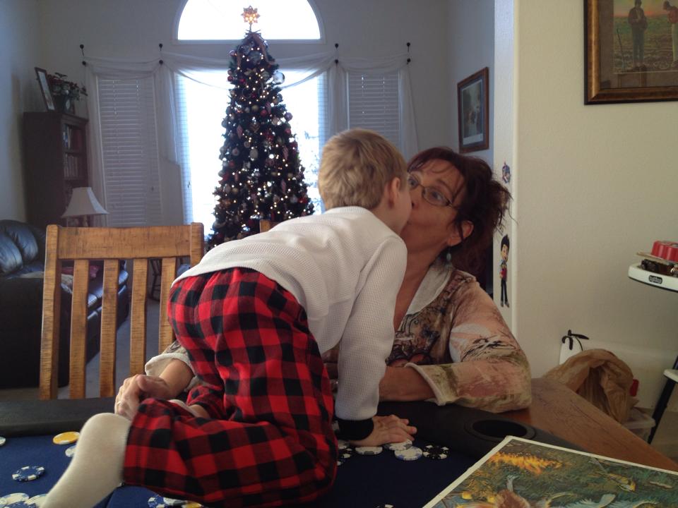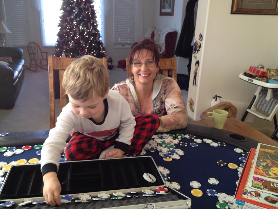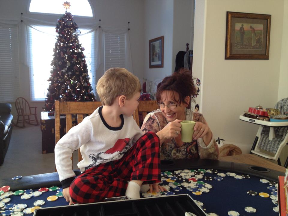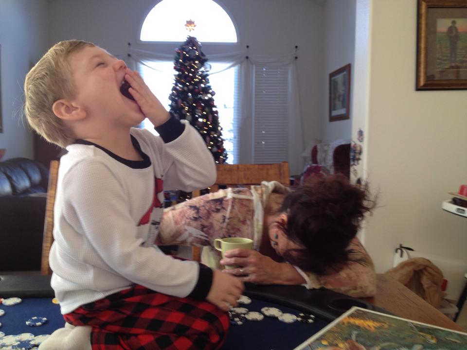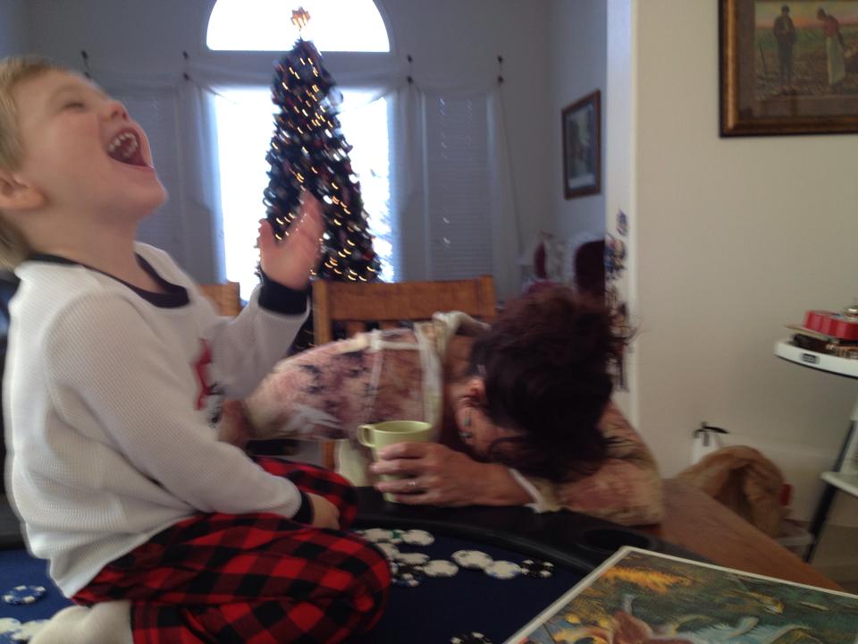 Sometimes words just get in the way, especially when pictures tell their own story so well. Here is a series of snapshots that my daughter (and co-author), Rachel, took one morning as we sat visiting and clowning around the dining room table where our big blended family had played a rousing game of poker on New Year’s Eve, the night before. To set the scene: I had been drinking coffee in the kitchen, when Rachel’s three-and-a-half year old son Jackson hollered, “Hey Nonny, there are cup holders in here!” (Meaning, “Come put your coffee in one of the cup holders around the table and play with me.”How could I resist?)
