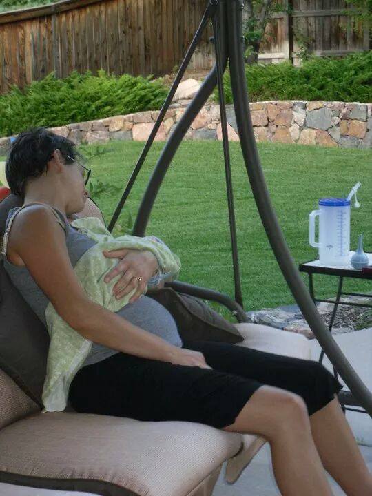 My friend Sue, a brand new mother, taking time out to rock her baby, and her own exhausted frazzled self on our porch swing.