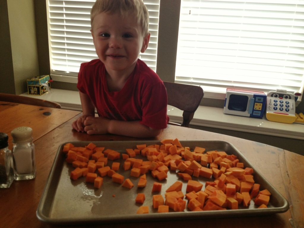 I don’t cook every day, but the days I do, the moments we are in the kitchen together, are often the moments we enjoy the most. The kitchen is a place where our lives intersect, where my almost 30-year old female joys and interests cross with my two-year old little boy’s interests. I don’t have to pretend that the lego tower we just built is the tallest most amazing piece of architecture I’ve ever seen. He doesn’t have to be patient with me as I make a quick call or pick up groceries. The smells of cloves and cinnamon, the colorful block puzzle from butternut squash, the sound of the blender engine purring excite us both. We don’t have to pretend. We just have to be. Together.