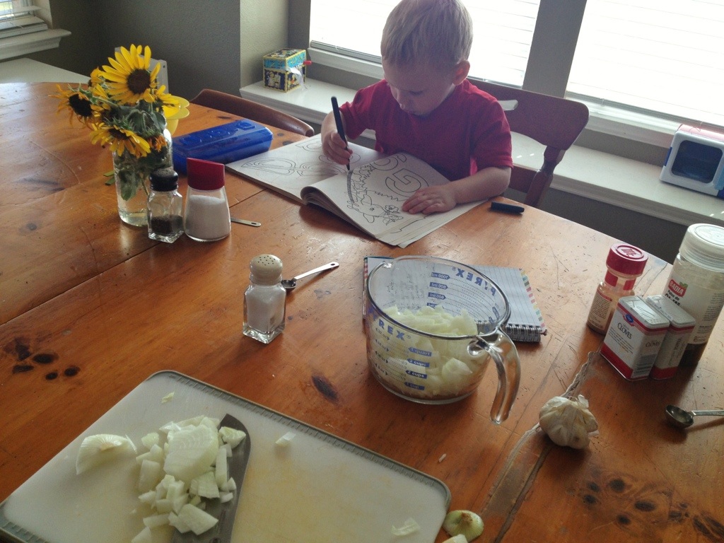 Cooking is mostly a piece of cake…because he can participate, he can be a helper. And even when he can’t help with something like chopping onions, he’s still content because we’re together and I’m talking to him, not somebody else on the phone or looking at a computer screen.