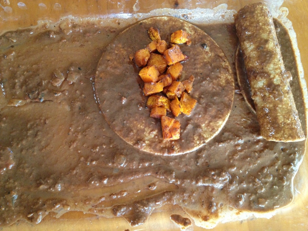 Reduce oven temp to 350. Ladle 1/2 cup mole sauce into bottom of a 9×13 casserole dish. Wrap corn tortillas in a damp paper towel and heat in microwave for about 30 seconds, just enough to warm them up and make them pliable. Dip corn tortilla into mole sauce. Fill with about two tablespoons of butternut squash and a sprinkle of raisins. Roll up. Repeat. Ladle a generous amount of sauce on top. Bake at 350 for 15 minutes.