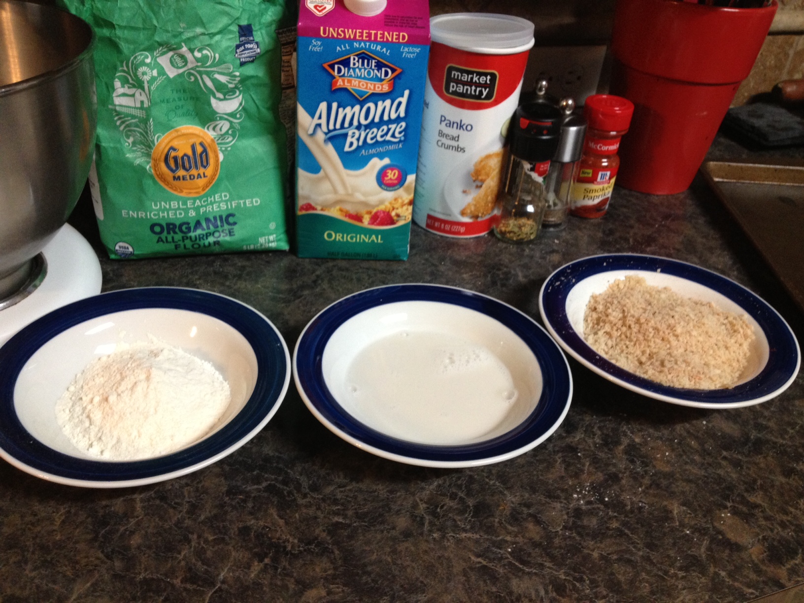 4. Make dredging station: Put flour in a bowl, milk in a bowl, and bread crumbs in a bowl. Stir in salt, pepper, smoked paprika, and Italian seasoning into the bread crumbs (about 1/2 teaspoon each seasoning to 1 cup of bread crumbs).